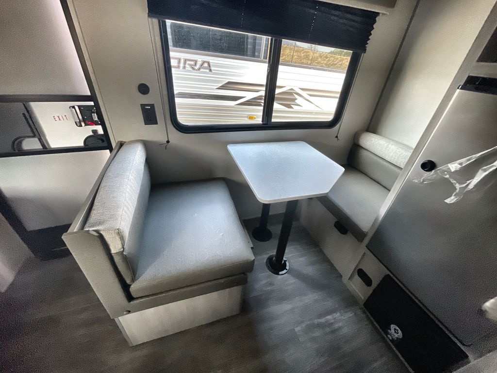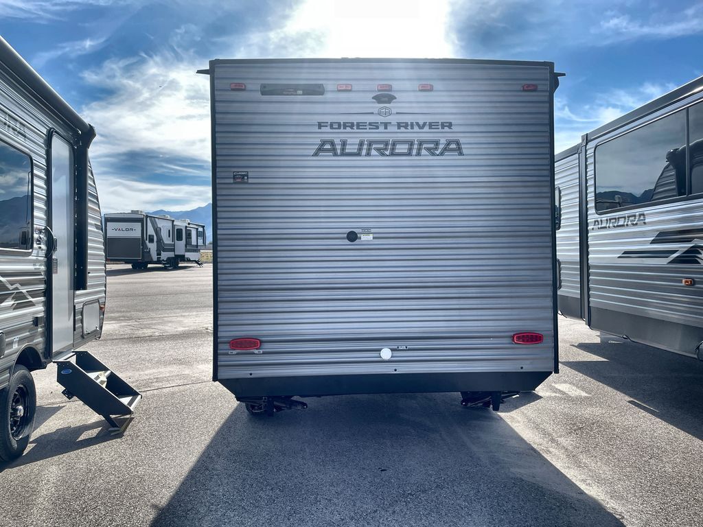 Comfortability, usability, and quality is what you will find in each one of these Forest River Aurora Light travel trailers! They are designed with a superior build and packed full with industry leading, functional, and distinctive standard features. The diamond plate rock guard will protect your unit from road debris and the nitrogen filled radial tires, which keep their pressure longer, offer better fuel economy. You will also find upgraded JBL Elite exterior speaker outside, an electric awning with multicolor lights and remote, plus flush mount baggage doors for easy packing. The interiors are beautifully designed with matte black kitchen and bath faucets, black nightshades in the living room, and GE kitchen appliances!