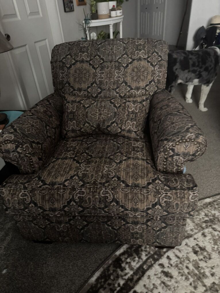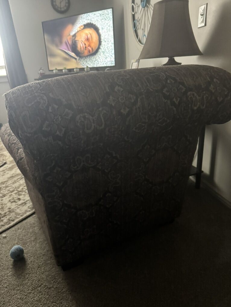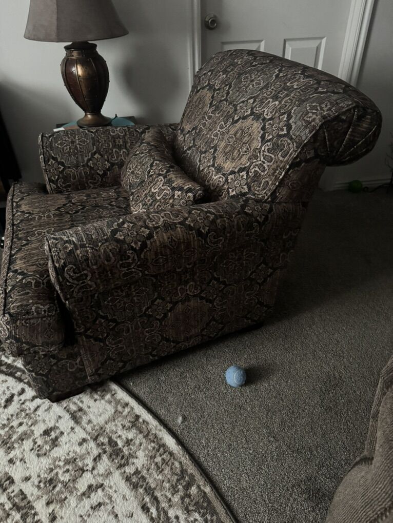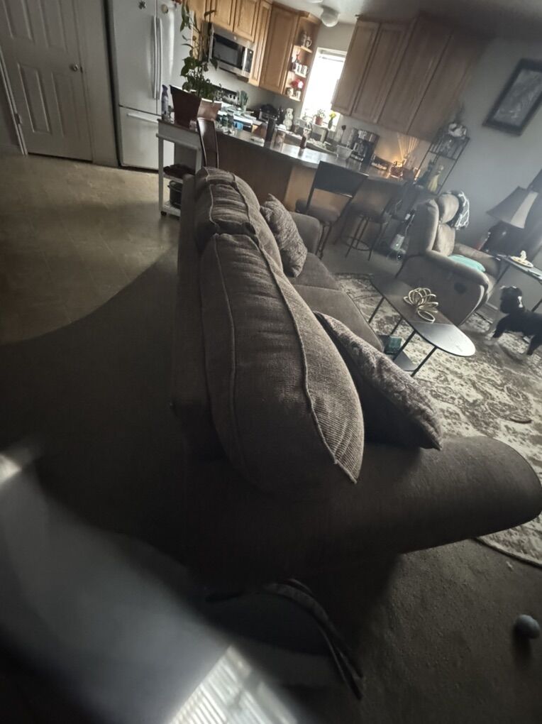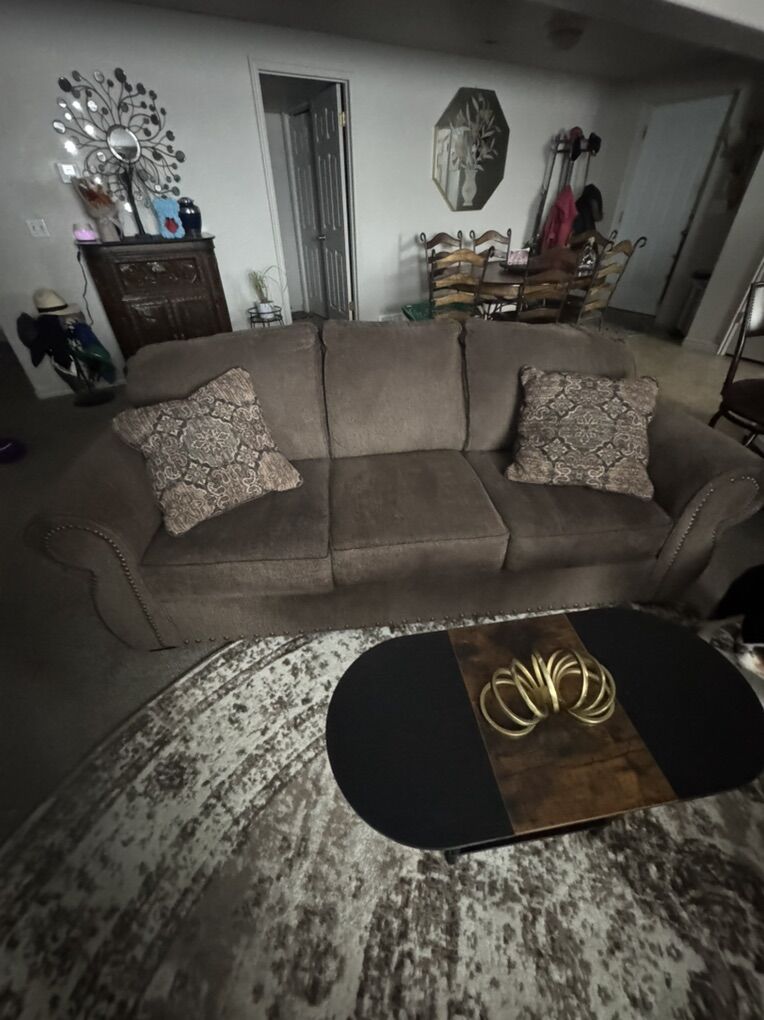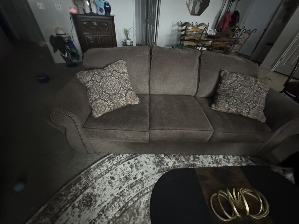 VenmoA 3 cushion couch with pillows A comfy chair that matches Made of a cloth material Brown color