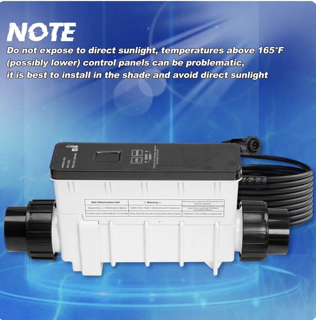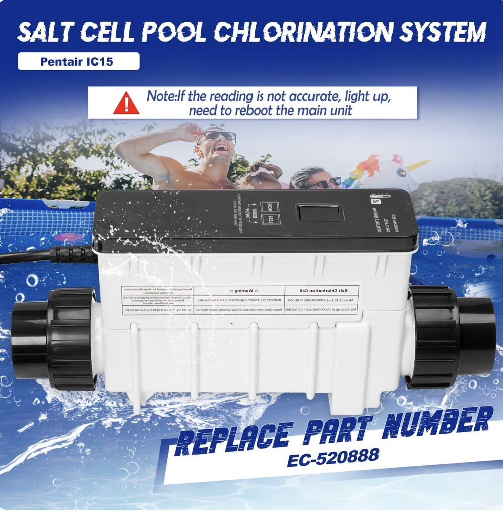 Salt Water Pool Chlorinator System: Compatible with Pentair IntelliChlor IC15 IntelliTouch, EasyTouch, and SunTouch automation systems. Fit for 15000 gallons swimming pools Display Panel: WiFi control allows you to track water flow, temperature and chlorine production in real time from your smartphone. The display panel provides an intuitive visualization of the product's operating values Efficient Chlorine Generation: Utilizing advanced technology, the Salt Water Pool Chlorinator System efficiently converts salt into chlorine, providing more enjoyable swimming environment for you and your family User-Friendly Operation: The Salt Water Pool Chlorinator System is designed with user-friendliness in mind. Its intuitive controls and simple maintenance requirements make it easy for pool owners to manage and maintain, ensuring optimal performance and long-lasting durability