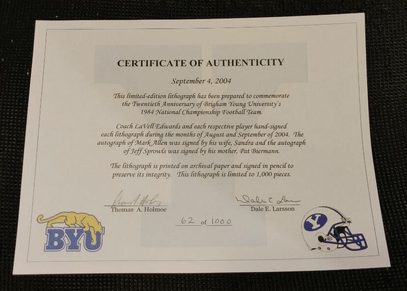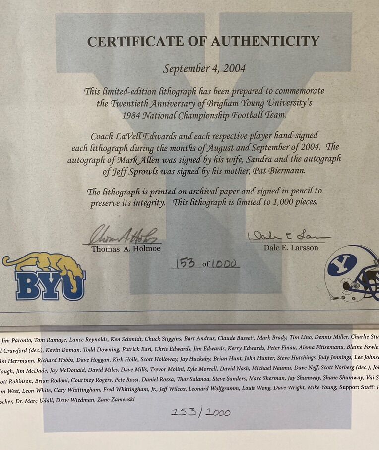 ApplePay(1) 1984 BYU Autographed National Championship Lithograph.