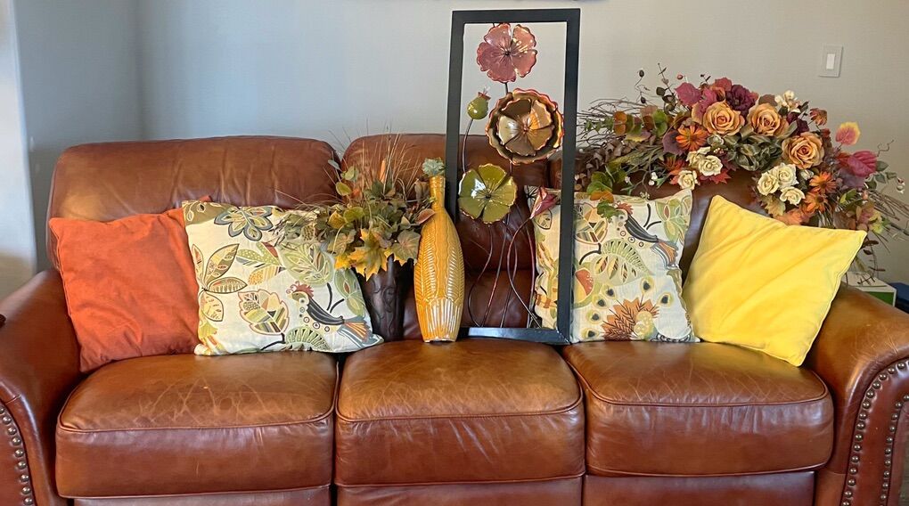 PayPalFall harvest decor bundle. Large floral wreath, and handing floral arrangement, metal floral wall decor, 4 accent pillows and tall decorative vase. Beautiful neutral earth-tone colors.