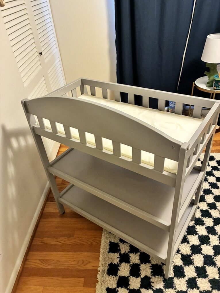 Features: • Strong wood construction with classic, long-lasting style • Water-resistant changing pad included for easy cleaning • Safety rails on all sides to help keep baby secure during changes • Two open shelves for diapers, wipes, towels, and essentials • 35 x 19.75 x 39.25 inches