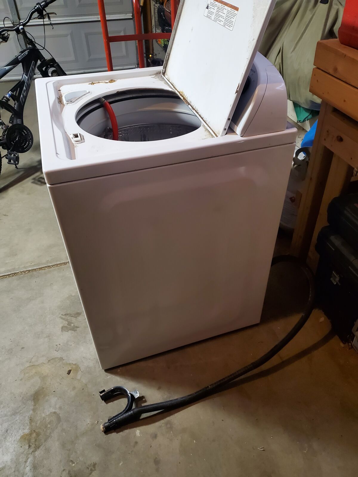 4.2 cu ft Whirlpool washing machine, about 8 years old. Works fine as long as you don't fill past about 2/3 capacity. If it is too full it makes loud thumping noises and moves around. Bought new at Lowes 9/2017. Used fill hoses available if desired. Cannot deliver. Located in Clinton.