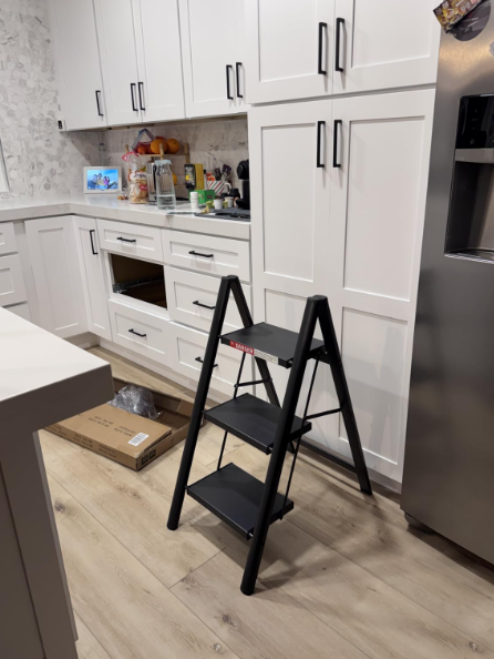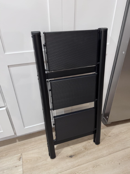 STABILITY AND STRONG STRUCTURE:Featuring a robust triangular design, this 3 step ladder provides a secure and stable foundation, ensuring maximum stability and safety. It supports a maximum load capacity of up to 330 lbs, making it a reliable choice for household use