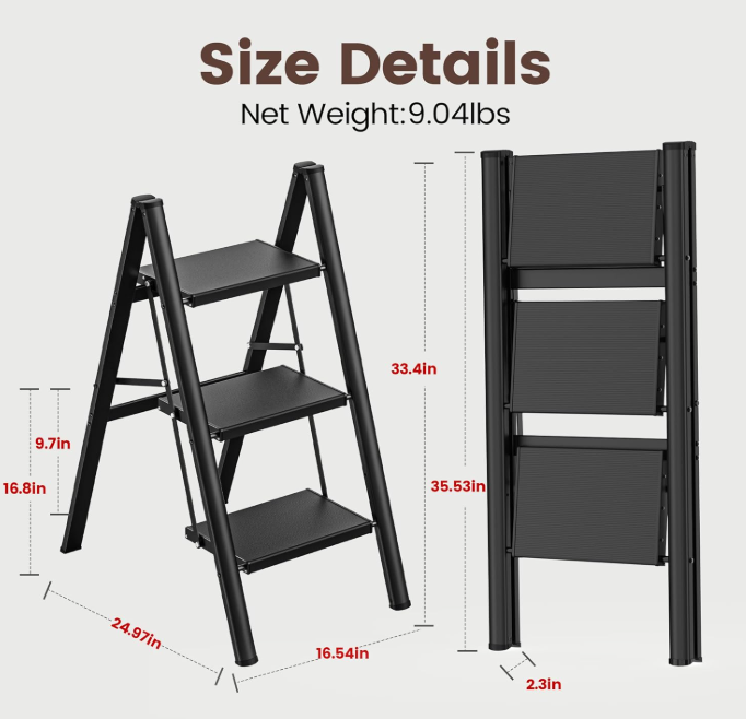 ZelleUPGRADE STEP LADDER: Open:16.5" x 25" x 33.4", Folded: 35.5" X 16.5" X 2.3", Net Weight: 9.26 pounds. HBTower Safety Folding 2 Step Stool is made for you
