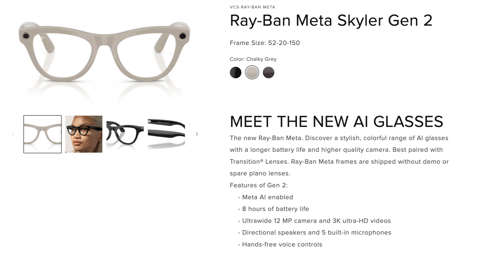 Technical SpecificationsFeatureSpecificationFrame StyleSkyler (Elegant Cat-Eye)Camera12MP Ultra-wide (3024 x 4032px)Video1080p at 30fpsStorage32GB (Stores 500+ photos or 100+ 30s videos)ConnectivityWi-Fi 6, Bluetooth 5.3Audio2x Custom Speakers, 5-Mic ArrayBattery Life4 hours per charge (36 hours total with case)