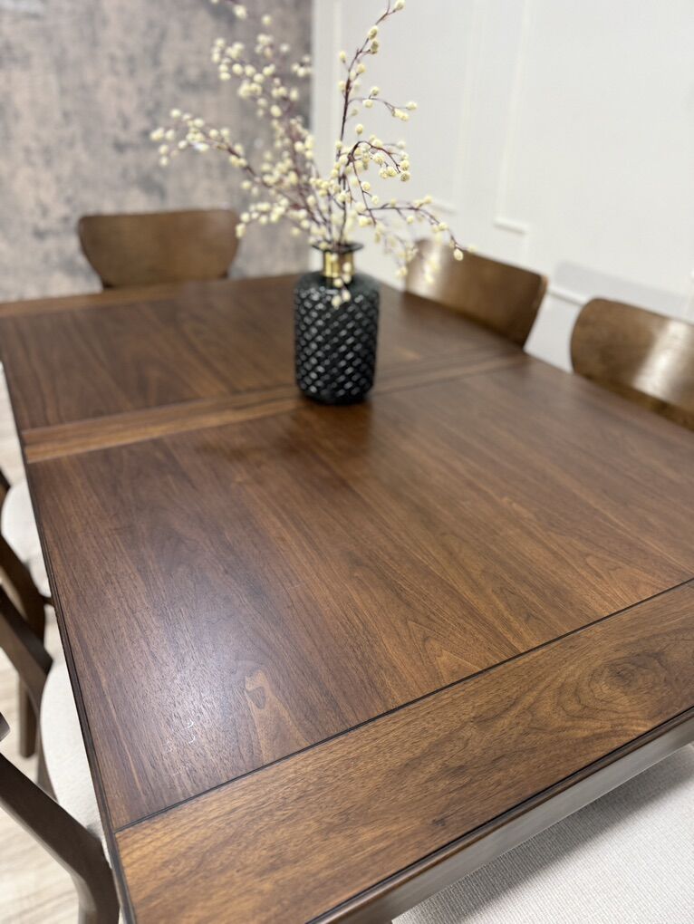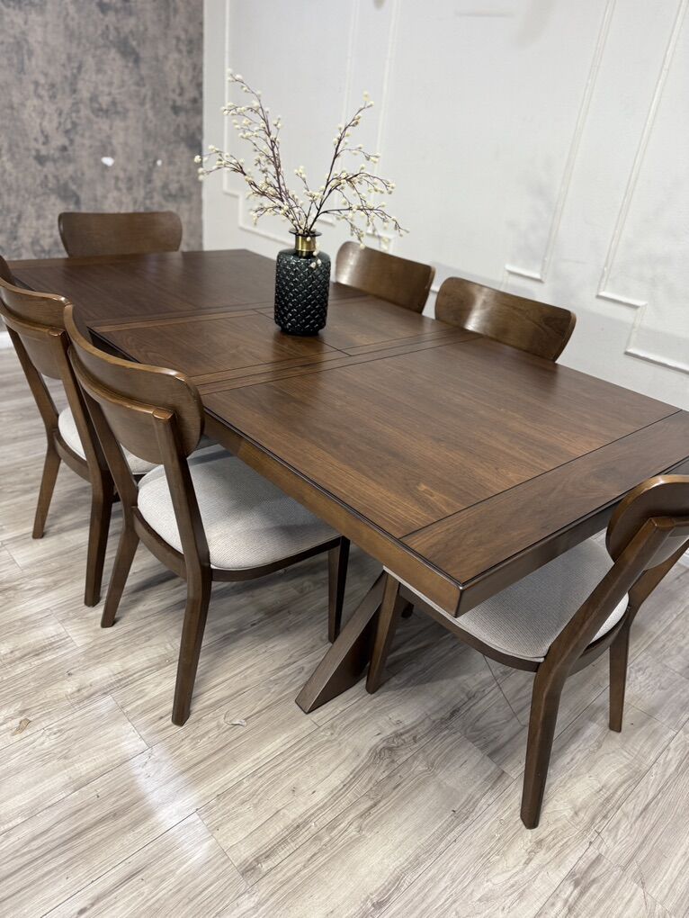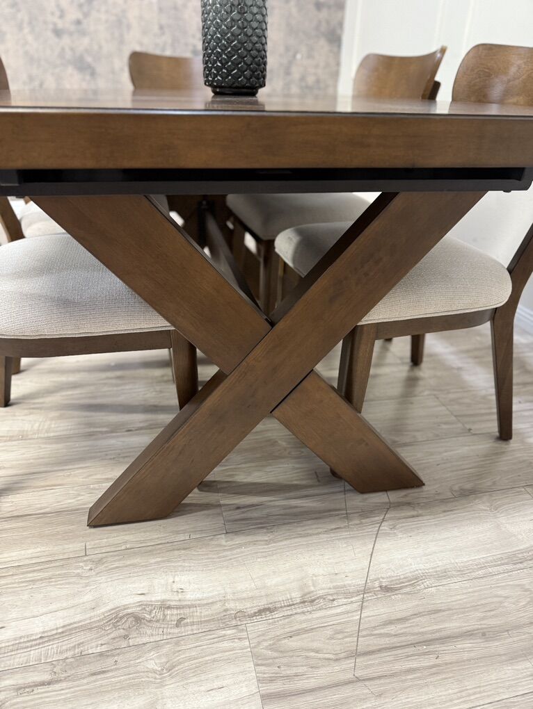 The modern 7-Piece Dining Table Set transforms modern farmhouse into contemporary chic. Rich brown walnut veneers and rubberwood solids make for a strong foundation for plenty of family dinners and friendly get-togethers. The picnic-style table features criss cross legs and a built-in folding leaf that easily extends your welcome to even more guests. Six fabric upholstered chairs, complete with foam seat cushions and protective floor glides, offer a comfy place to sit back, relax and enjoy good company and good food.
