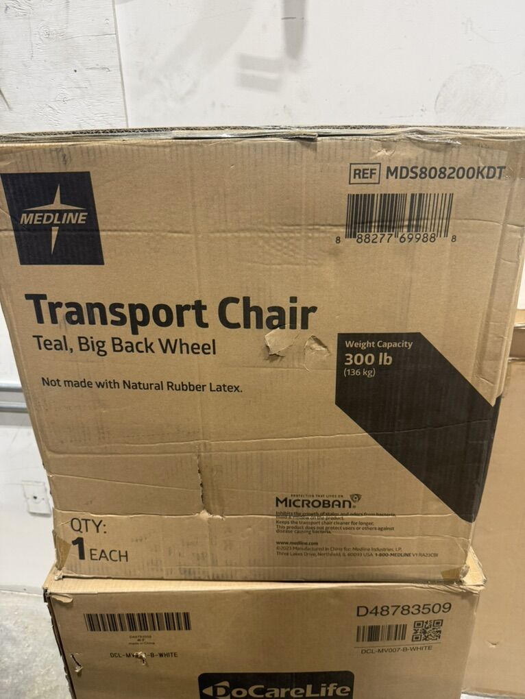 Medline Basic Steel Transport Chair with Microban Protection, Permanent Full-Length Armrests, Swing-Away Footrests, 8-Inch/12-inch Wheels, 300-lb. Capacity, Gray/Teal, One
