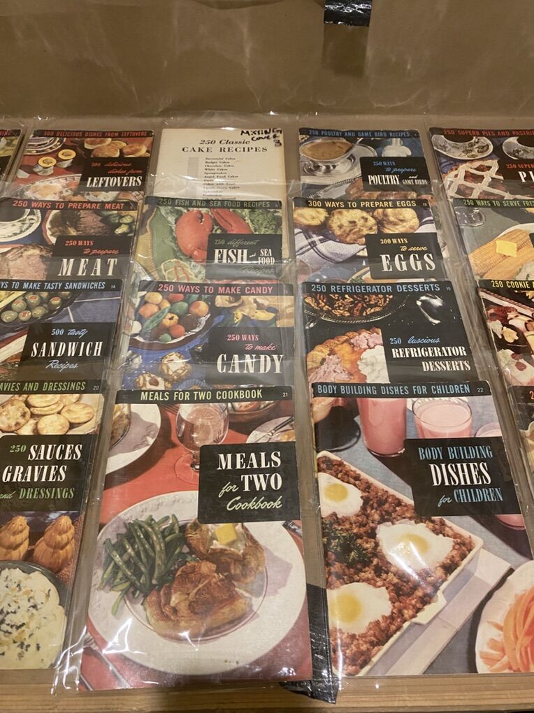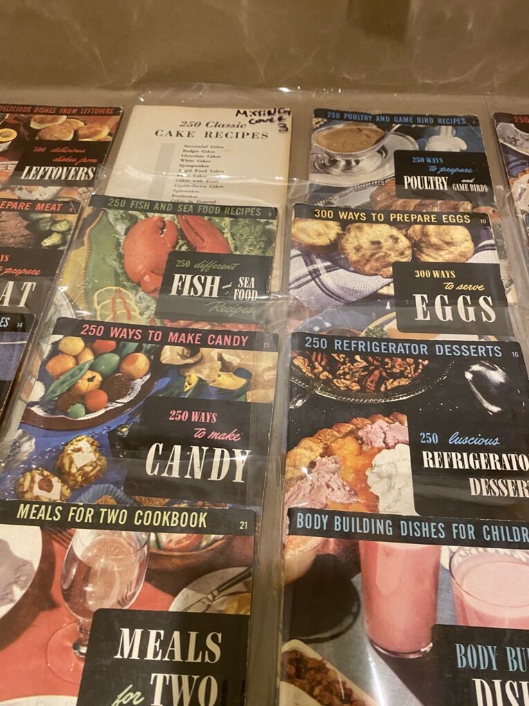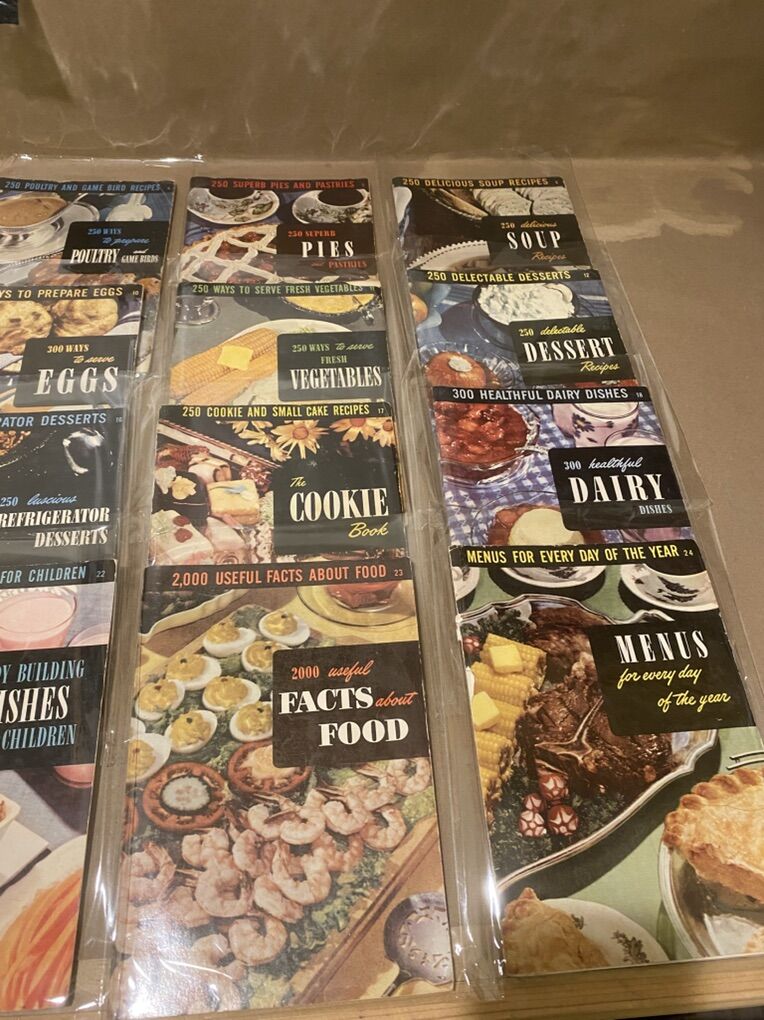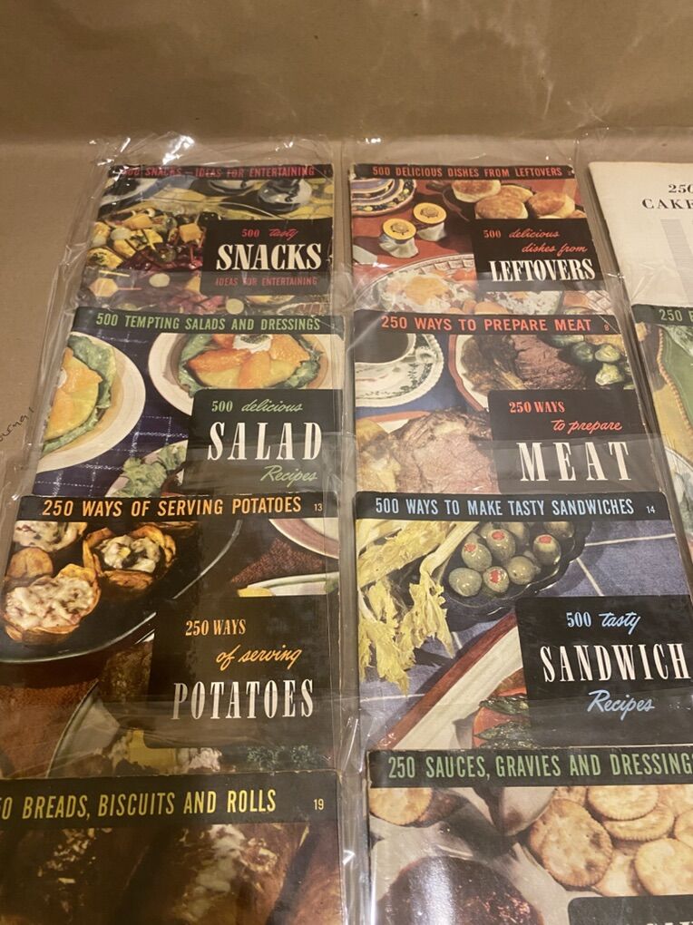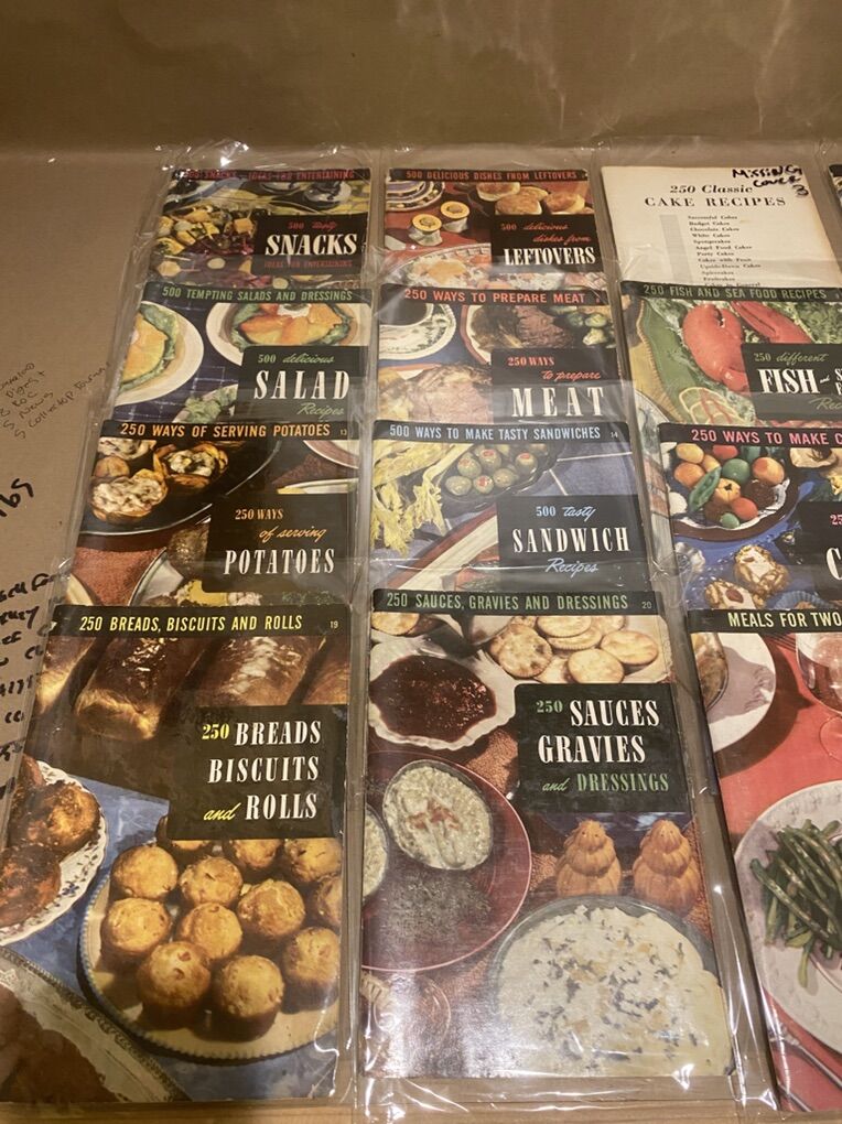 VenmoI inherited this set of 1950s Culinary Arts Institute Cookbooks from my grandpa who got them from my great grandmother. This appears to be a full set of all 24 books. Book 3: 250 Classic Cake Recipes is missing the front and back cover page, the rest have what I would call normal wear and tear from being almost 75 year old paper books lol. From what I’ve looked up and seen online it’s kind of hard to find a complete set, I’d prefer to sell as a set but, I’ll piece them out if I need to it’ll just be a bit more. Asking $5 each or $60 for the whole set of 24. Im located in Tooele, FCFS, holds with Venmo / CA only, shipping available. If you have any more questions or offers or want more pics feel free to reach out!