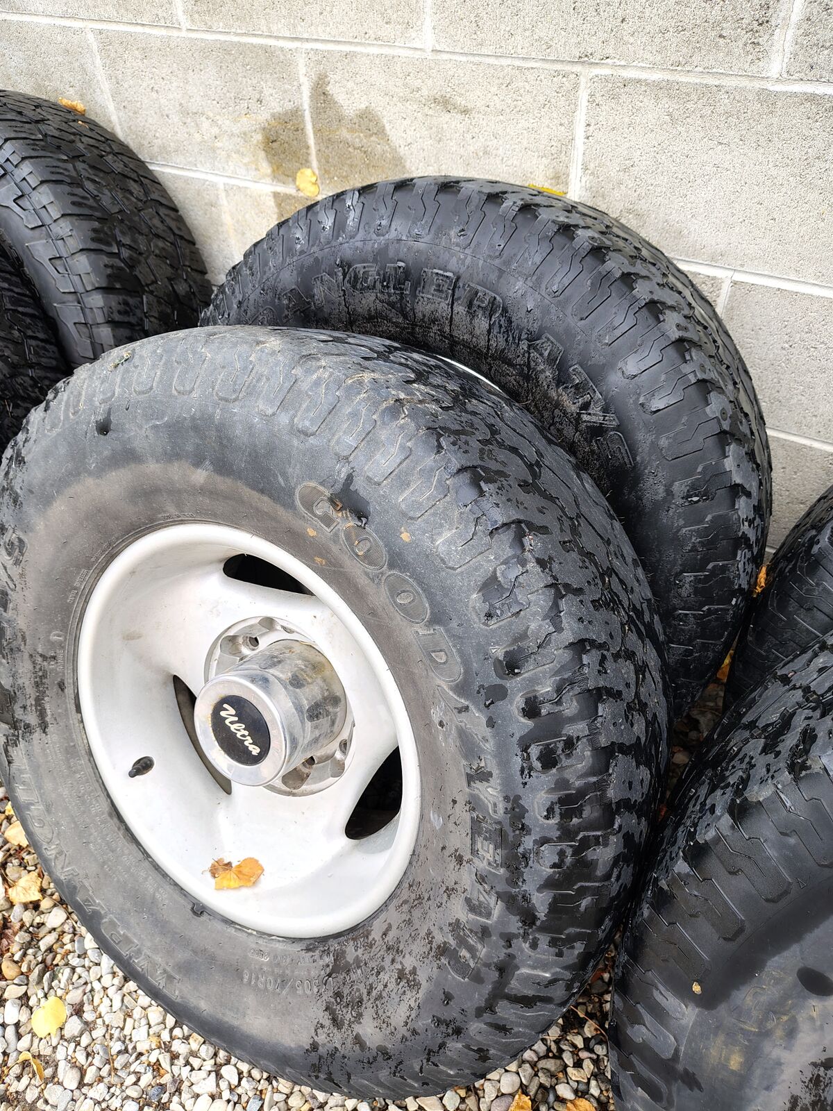 VenmoTires 2 sets, 4 ea, 8 lug, fits Chevy or Dodge trucks Chrome set $600.00 tire size P285/70R17 Aluminum set $100.00 tire size LT305/70R16