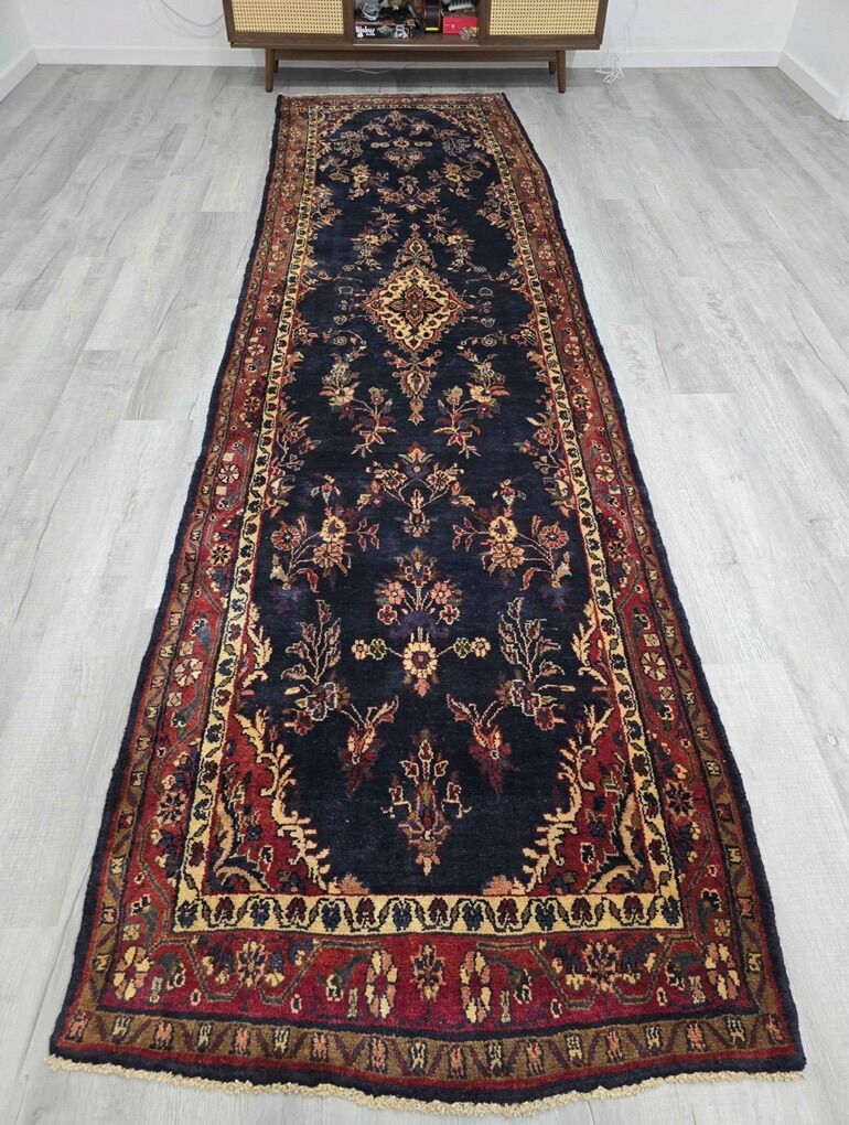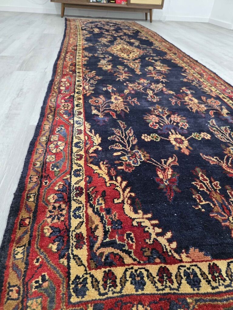 A gorgeous long runner displaying a deep indigo field filled with floral motifs in rust, amber, blue, and green. At the center lies a diamond-shaped medallion and surrounding the field is a golden-yellow internal border and a crimson-red outer border. The interplay of dark and luminous hues gives this rug a refined and inviting presence.