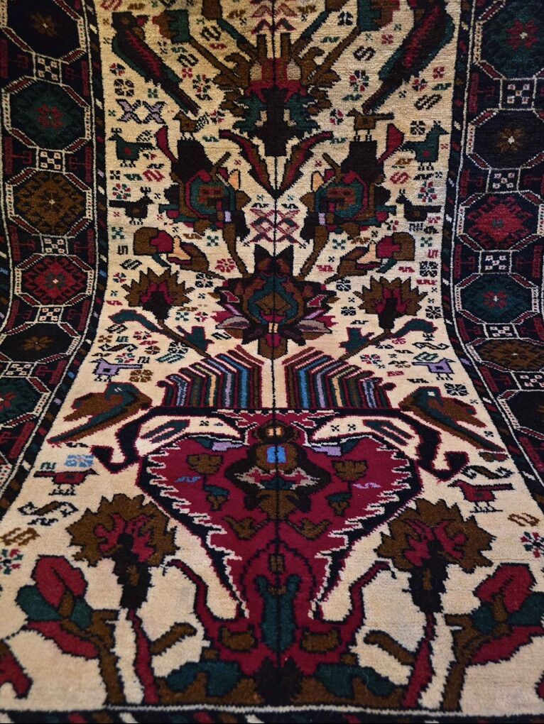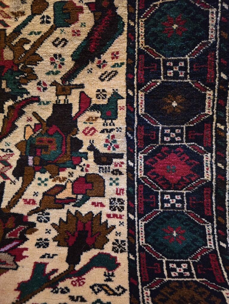 ZelleFlower design rug with a creamy ivory field that makes the rich jewel tones of deep teal, magenta, chocolate brown, and midnight navy really pop. I love the birds surrounding the flowers as well. The wide navy border frames the rug beautifully with complimentary colors of emerald, rust, and crimson. A balanced rug; it's detailed but not too busy.