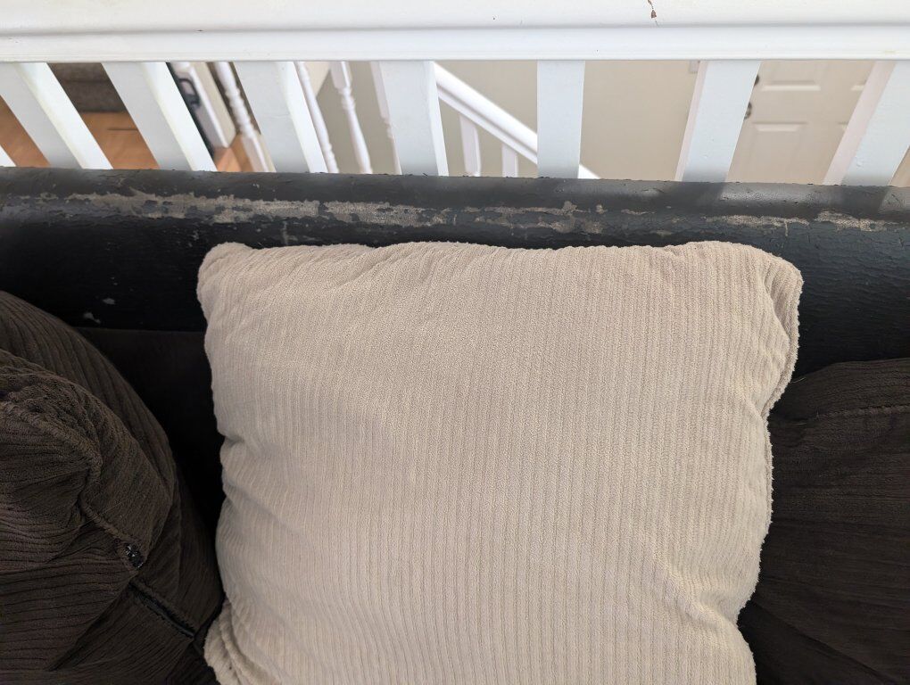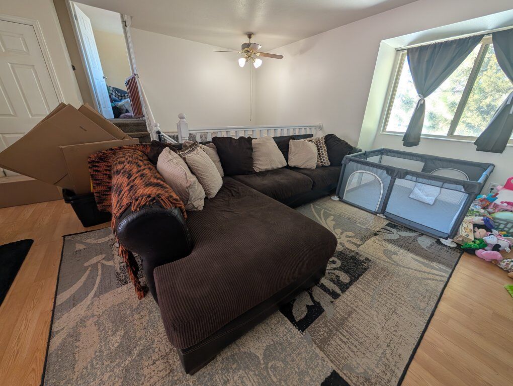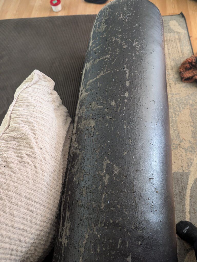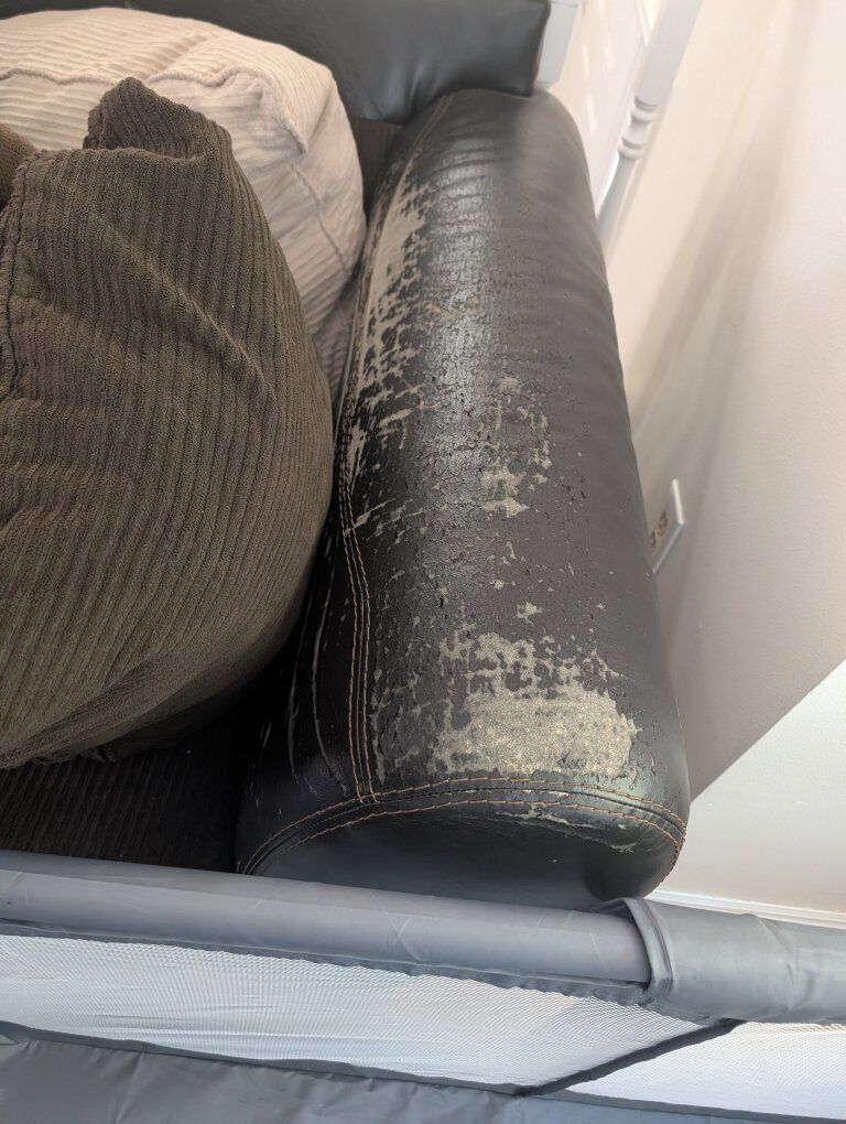 Free sectional. Faux leather on arms and back is worn and peeling. Does split into two pieces. All cushions and and back pillows have zippers for easy washing. Must pick up by Saturday or will be going to donate it.