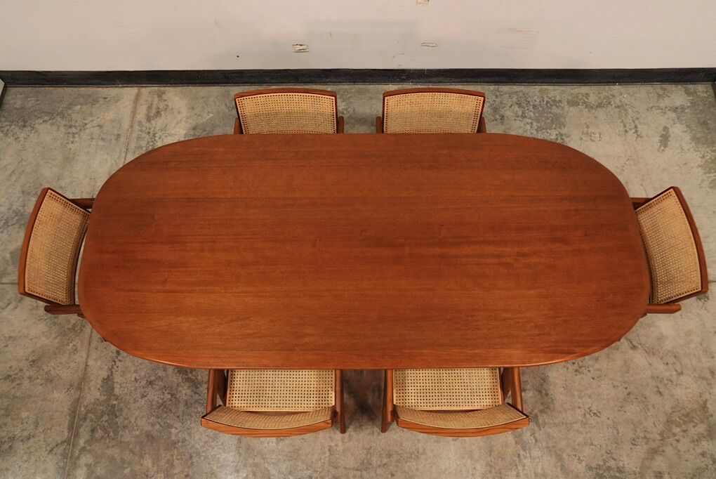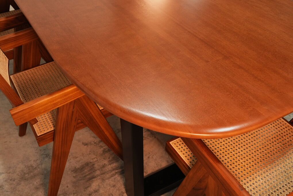 Each tabletop requires more than 50 hours of advanced CNC machining before being hand-finished and sealed. The surface is protected with a durable, UV-cured finish, available in a warm teak-tone color match or a natural clear coat that highlights the character of the wood.