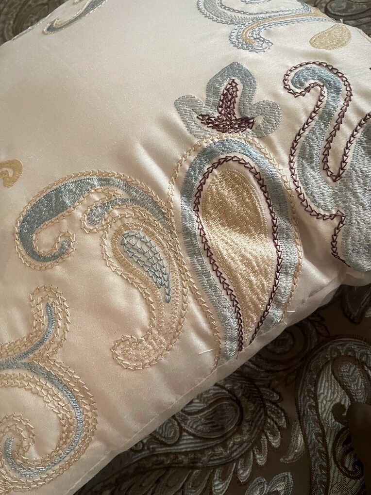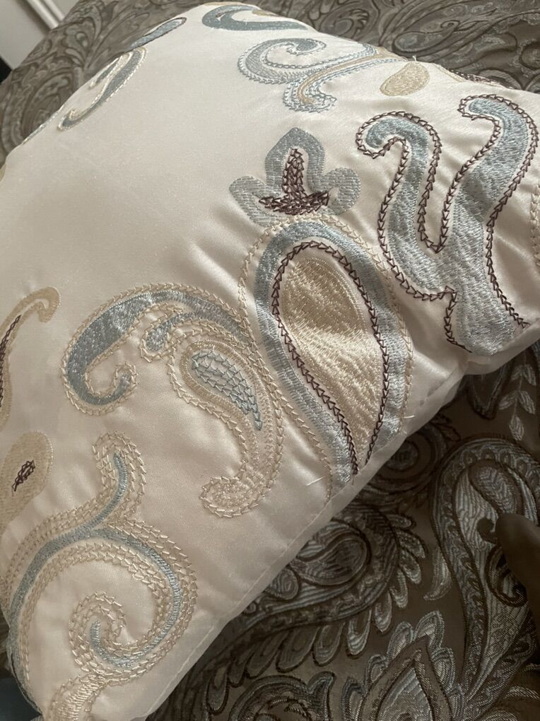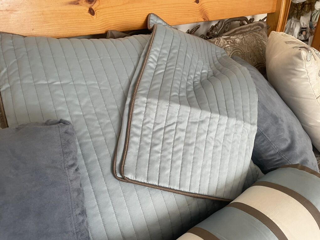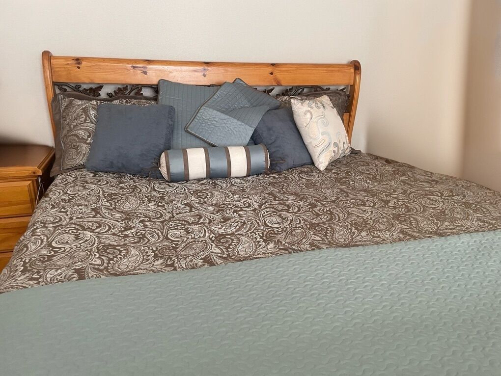 Includes: Cali-King mattress Headboard with leaf scroll Footboard with leaf scroll Side rails Slates Full comforter set Sheets included if wanted