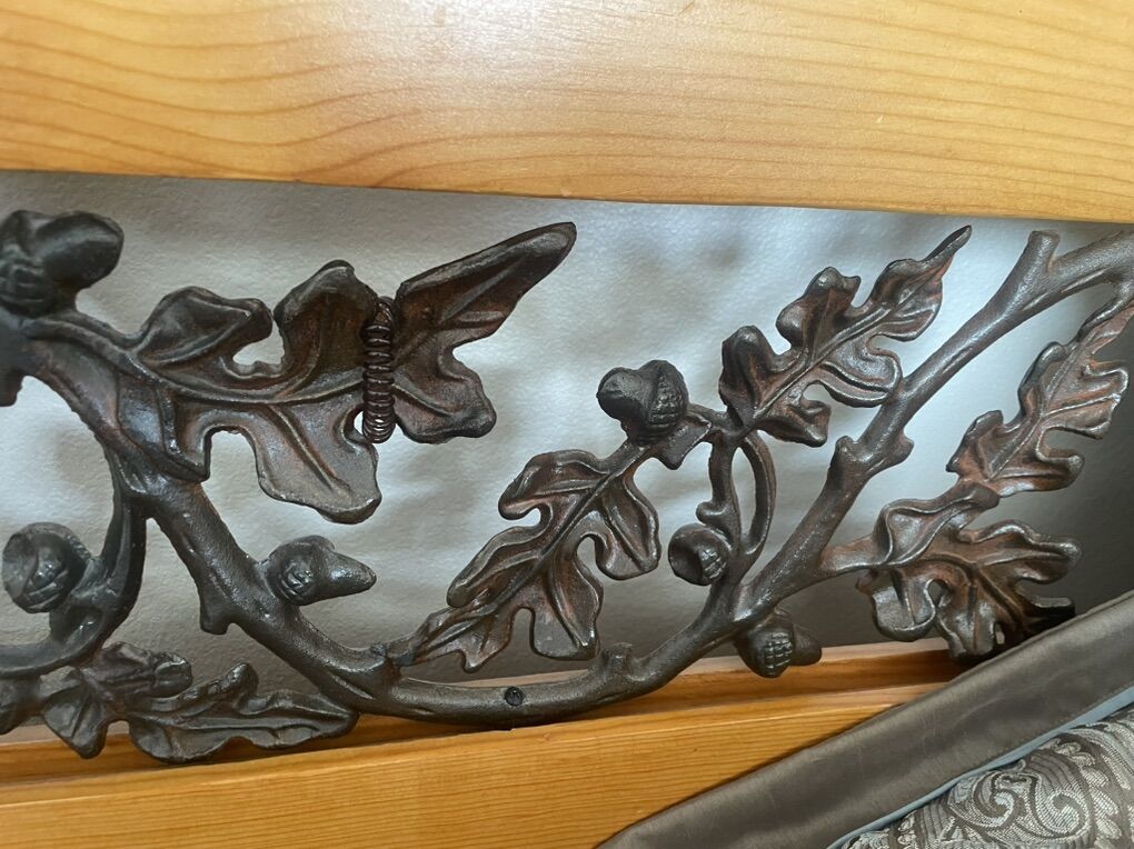 PayPalBeautiful solid wood Cali-King bed set with decorative metal leaf scroll detailing. Very sturdy and heavy. Has come dings and dents from normal wear and tear but they are only cosmetic. Have loved this set up but downsizing. Pet and smoke free home. Mattress has always had a topper and cover. Topper and night stand not included.