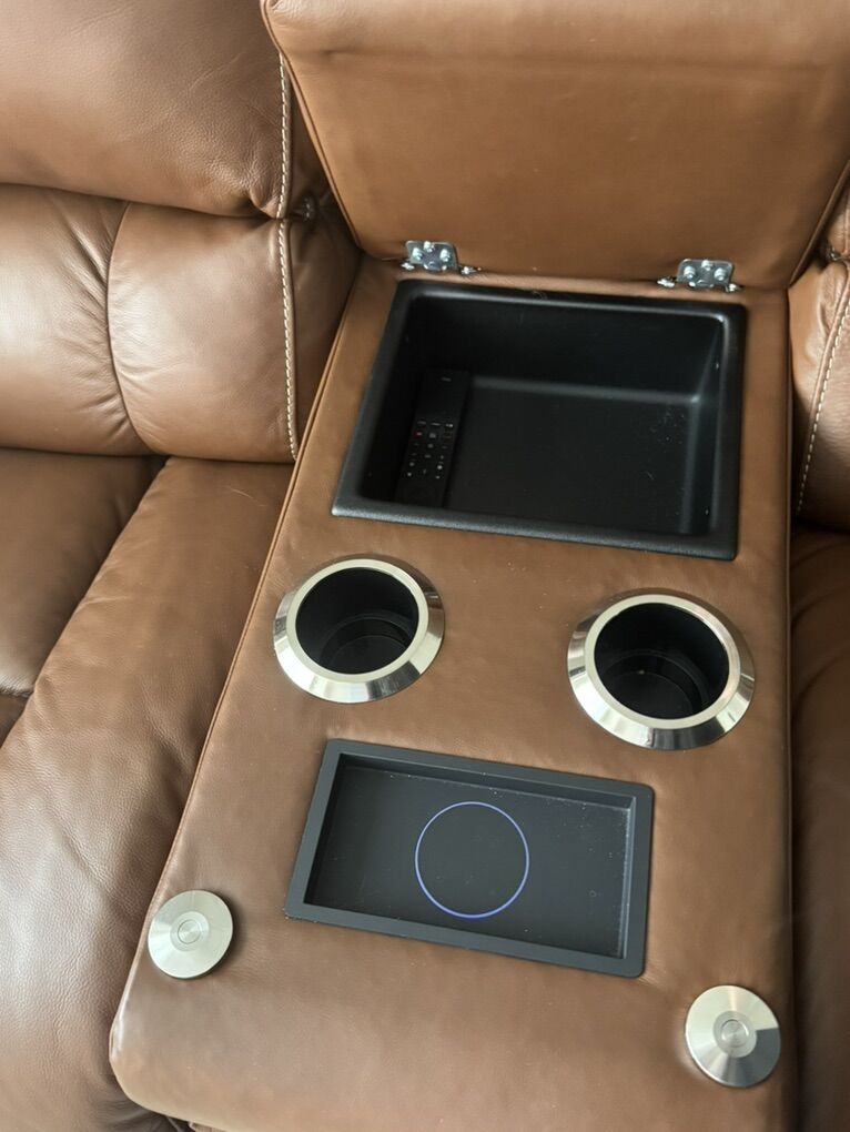 VenmoBrand new la-z-boy leather power reclining loveseat and recliner. Purchased in October and only sat on a few times. In perfect condition. These are a camel color and real leather. Remotes on the side for each seat to recline, adjust headrest, and adjust lumbar. Loveseat includes outlets and usb in the top storage space. Measurements included in the images. Purchased for $6000, Firm on price since these are new. Must pick up.