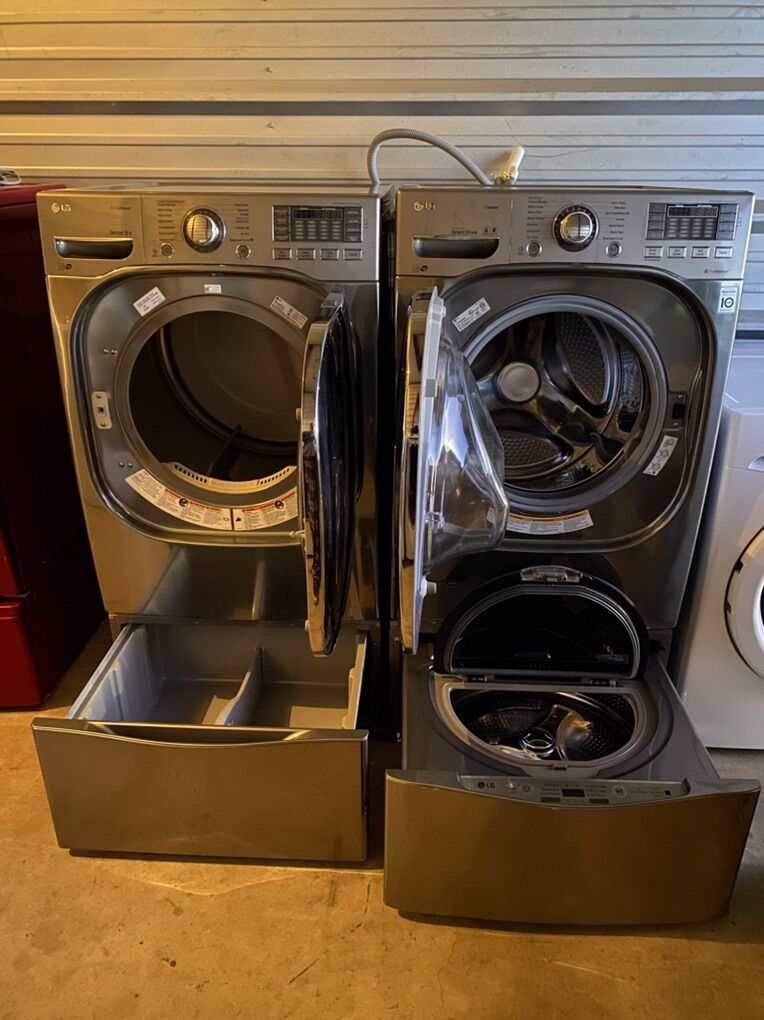 LG steam washer and gas dryer for sale. The washer has 2 washers as you can see in the picture. It has 14 cycles, 5 wash temps, 5 spin speeds, 5 soil levels and 5 signals. The dryer is a LG gas dryer with pedestal it has 14 cycles, 5 dry levels, 5 temp controls, 5 time dry and 5 signals. They are in very excellent working condition and are also a beautiful set. CASH ONLY. We can also deliver for some gas money.. Call or text me at 435-538-0178