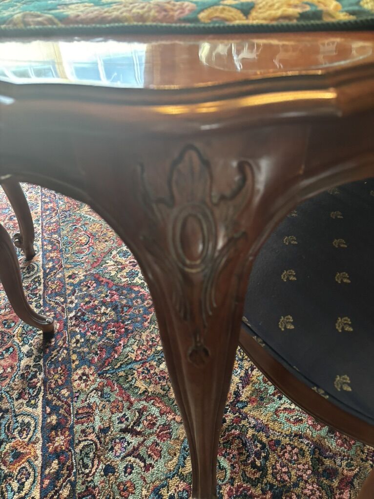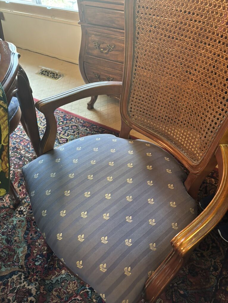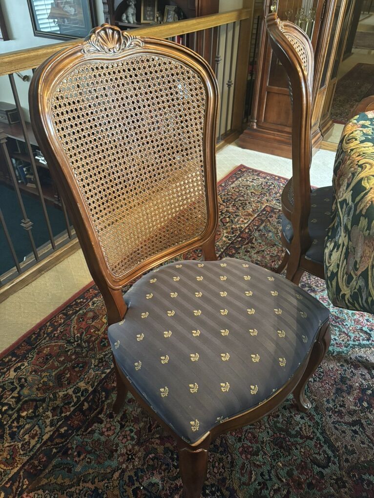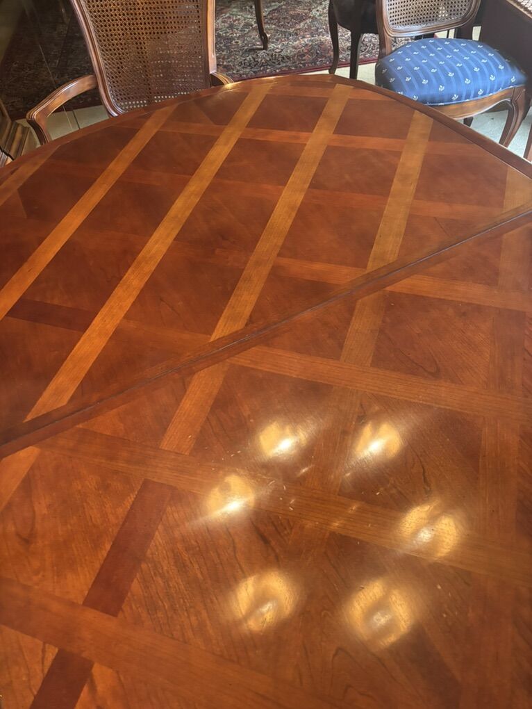 Very good condition Cherry wood dining table made by century furniture in Hickory , North Carolina. Purchased at Tribes Home furnishings in the mid 80’s parquetry& straight-grained Cherry, Table is 44 wide 66 in long & each of 2 leafs can add 22” 2 arm cane chairs & 4 reg chairs. Very well taken care of!!!