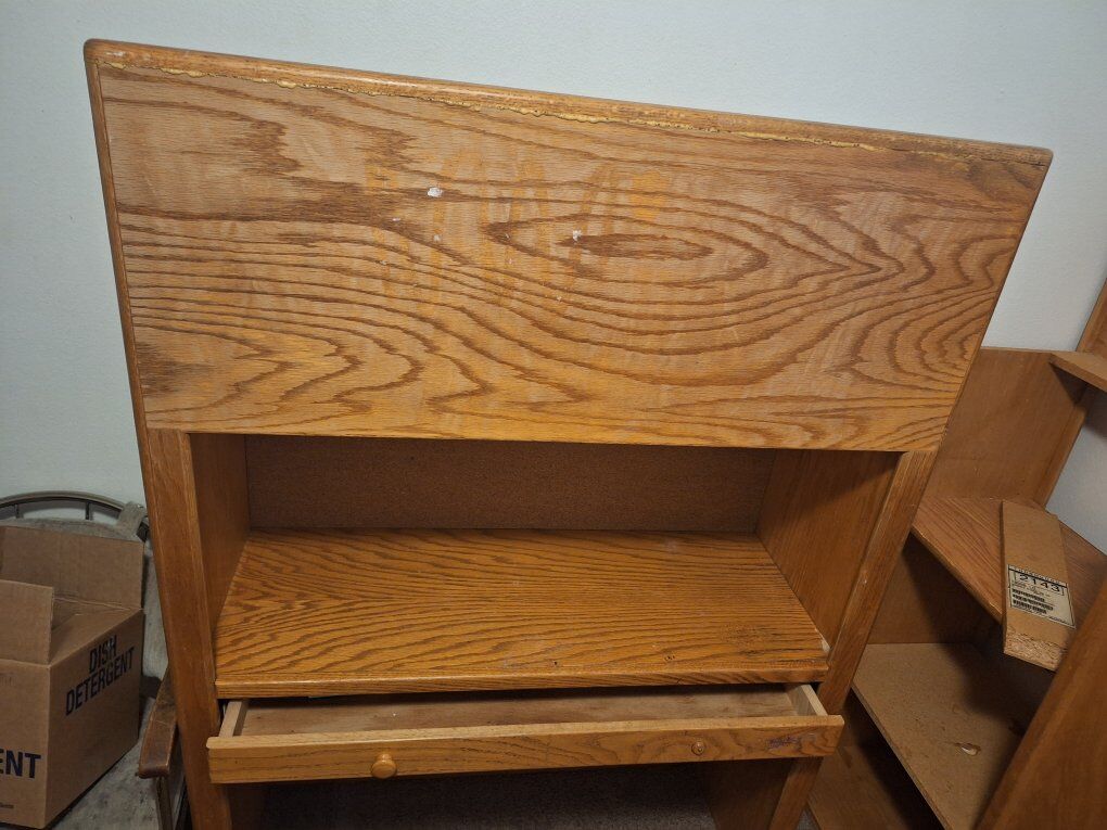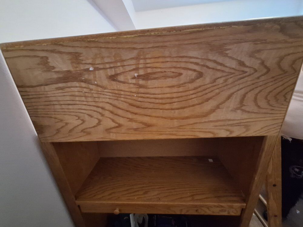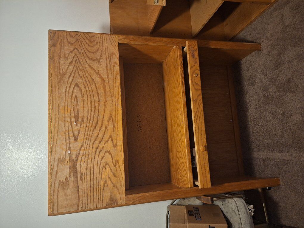 PayPalFull-size Loft bed made of sturdy wood. At the front end of the bed there is a desk area with a pull out desk drawer. On the other end there is a door that opens up and 2 storage shelves inside. Under the bed in the open space is another 3 shelves for storage. Comes with a wooden ladder that attaches to the bed. No mattress is included. Pick up only. Asking $250 obo