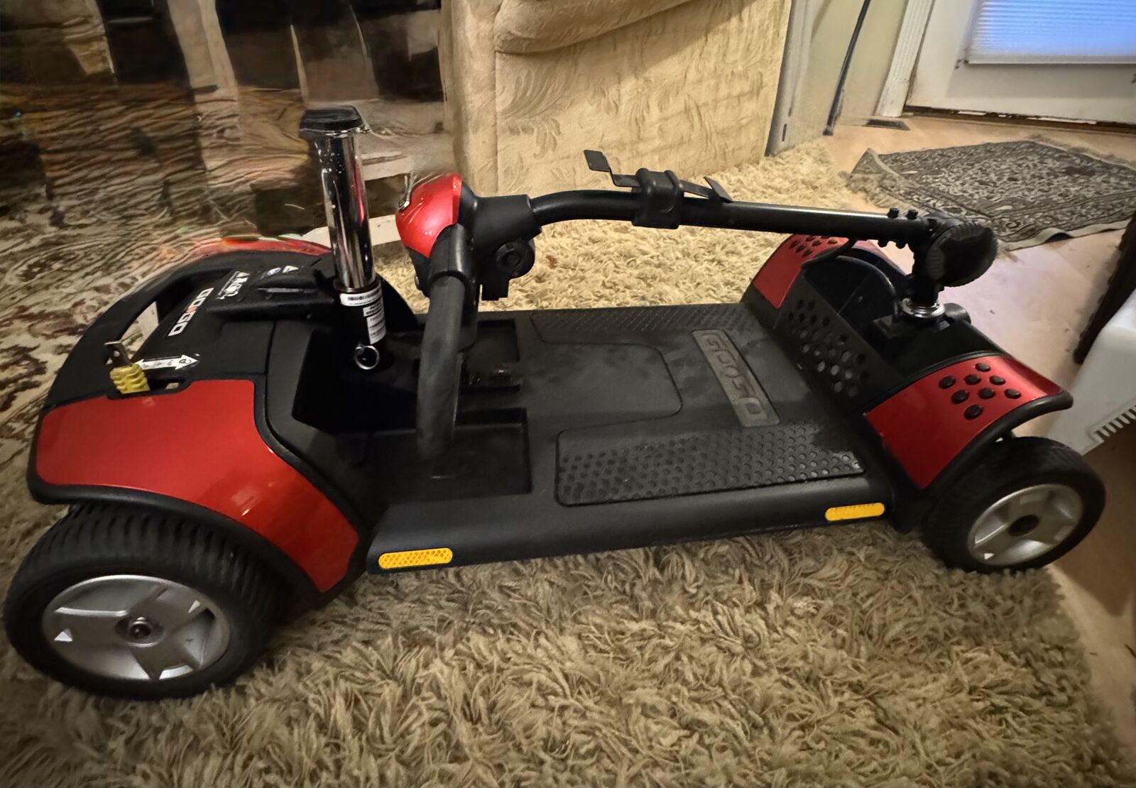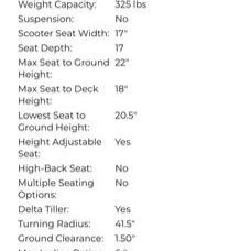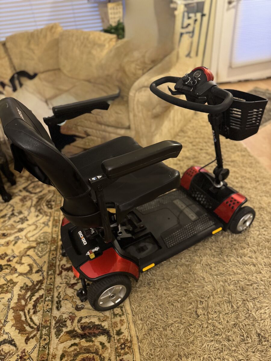 VenmoMAKE AN OFFER Portable Pride Go Go Sport electric scooter. This 4-wheel scooter is super easy to take apart and put back together. It has a range of about 14.5 miles and can go up to 4.4 mph. Max weight capacity is 325 lbs. Comes with a delta tiller and flip-back armrests. It's about 43 inches long and 21.25 inches wide. Heaviest piece is 44 lbs. Has an 18 AH battery and a front basket plus a rear cargo basket for your stuff.