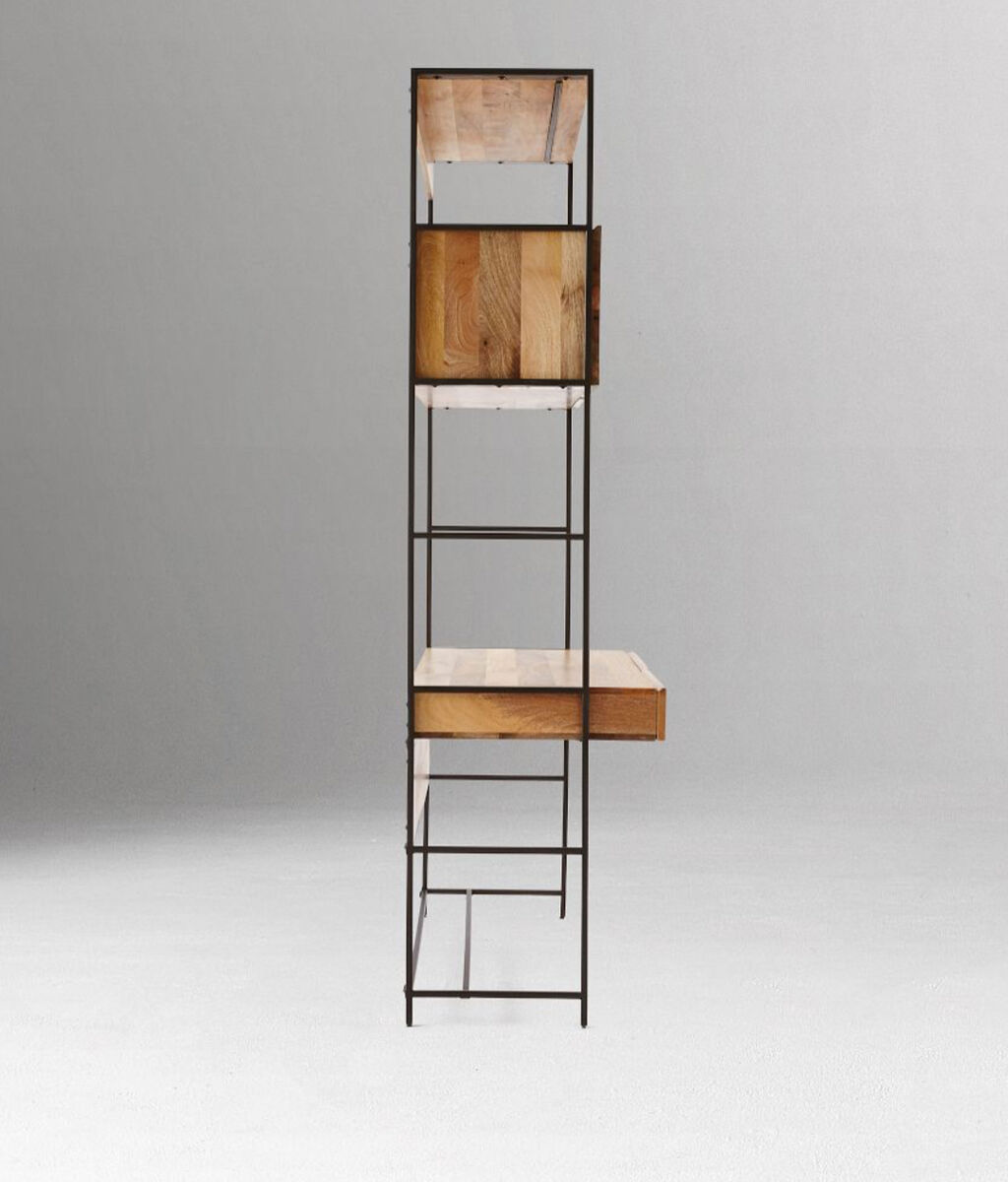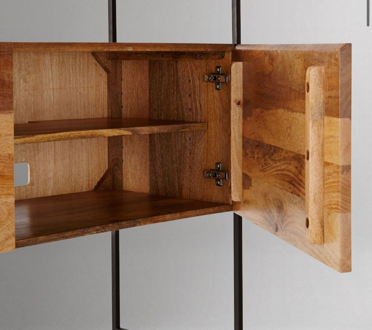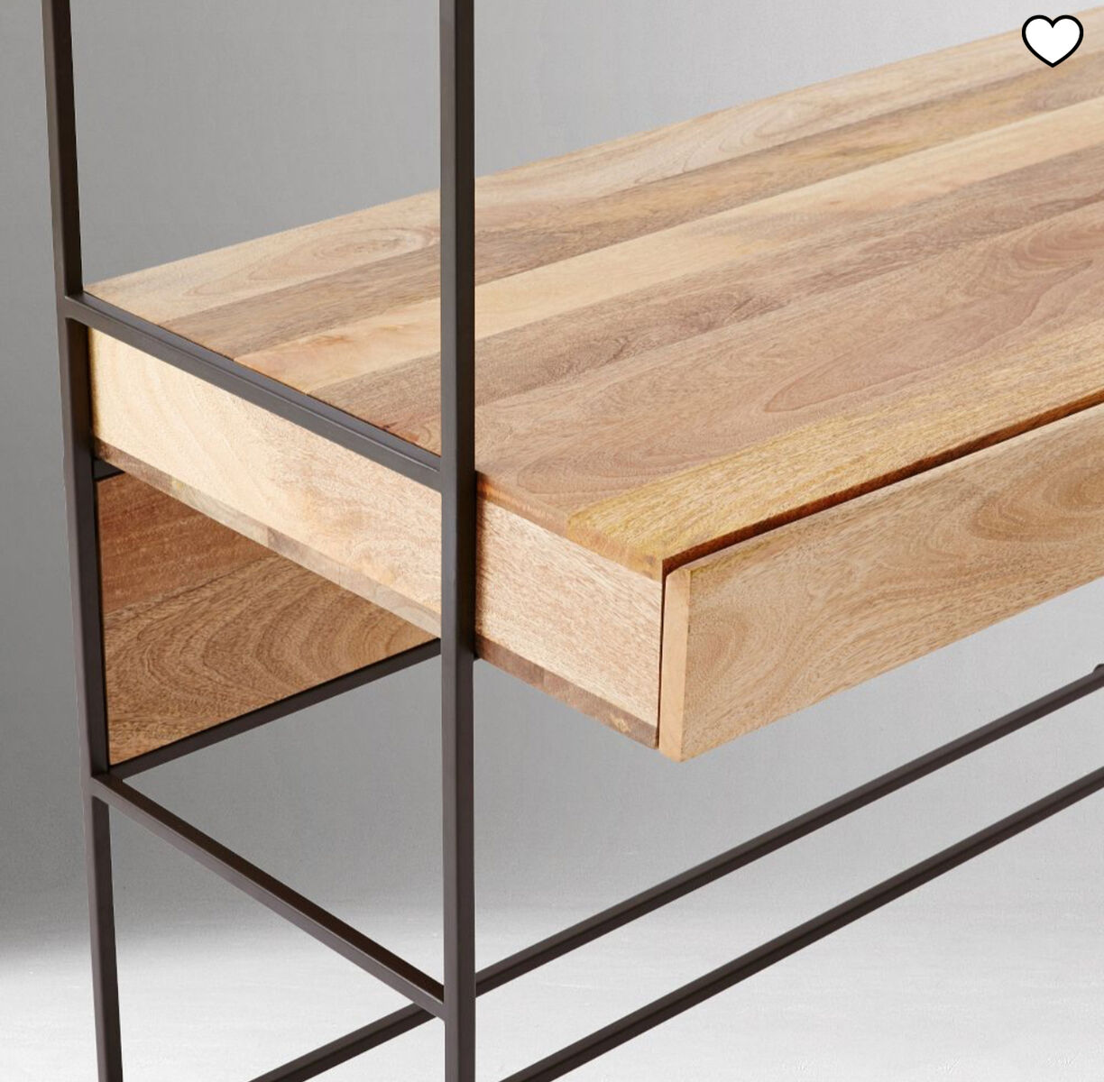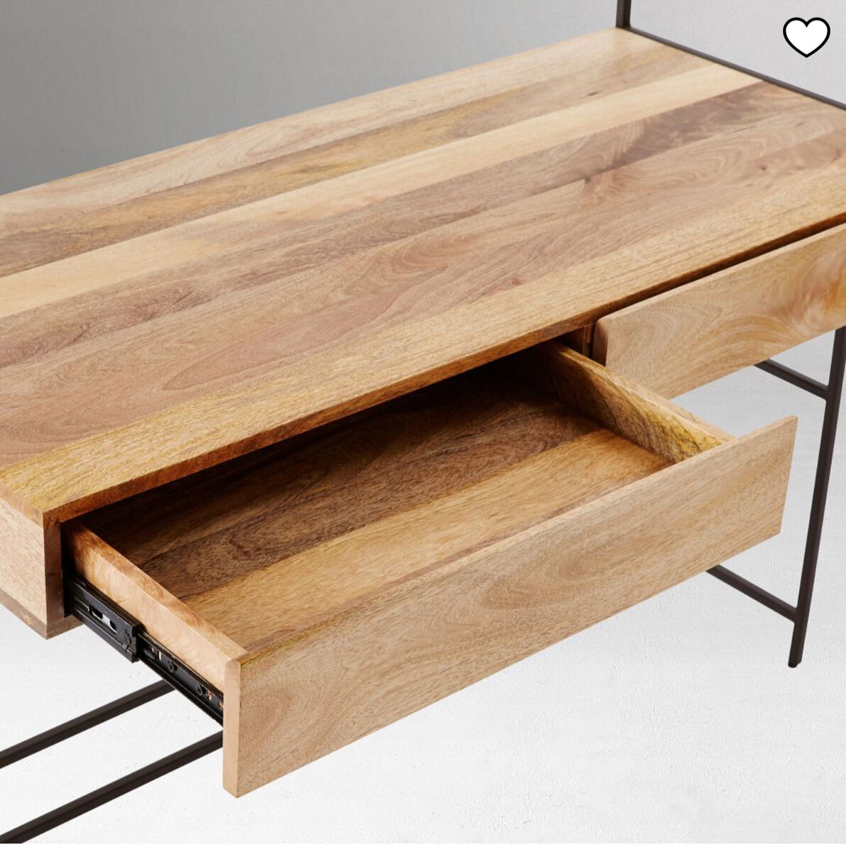 VenmoGently used. Excellent condition. Solid mango wood with natural color variations. Blackened steel frames and legs. Features one fixed shelf, one concealed cupboard and a desktop. Desk features 2 drawers. Finished on all sides. The mango wood used on this product is sustainably sourced from trees that no longer produce fruit. Made in India.