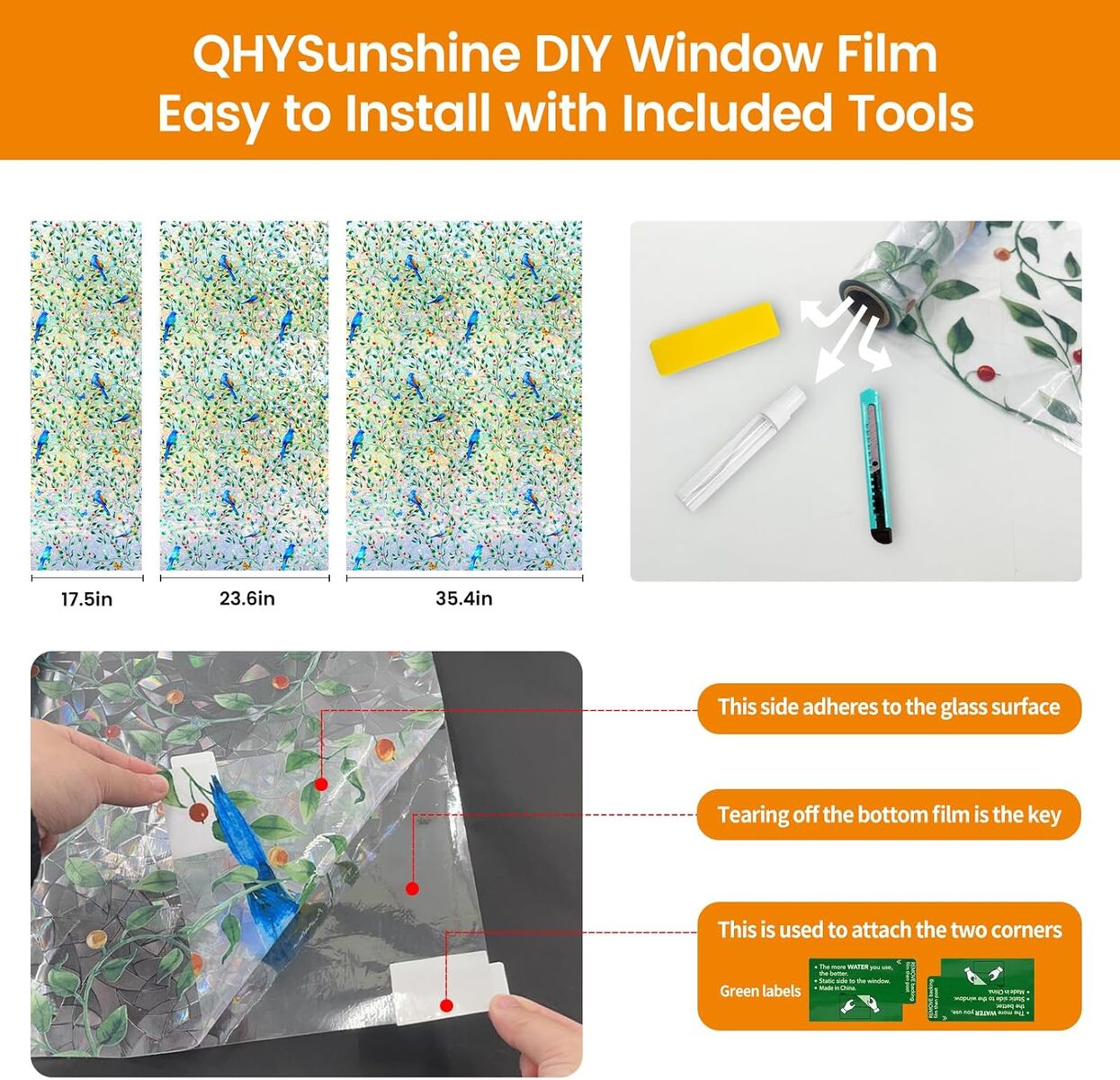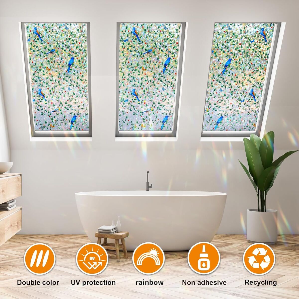 ApplePayStained Glass Rainbow Window Privacy Film featuring a Colorful Birds on the Vine design (35.4" x 78.7"). Non-adhesive, reusable, and easy to apply — adds privacy while creating a beautiful decorative touch.