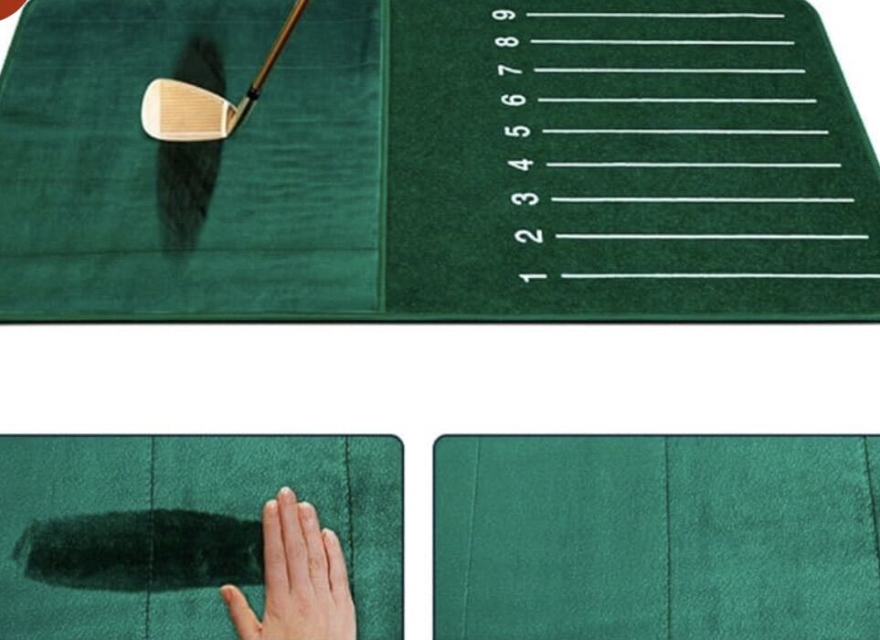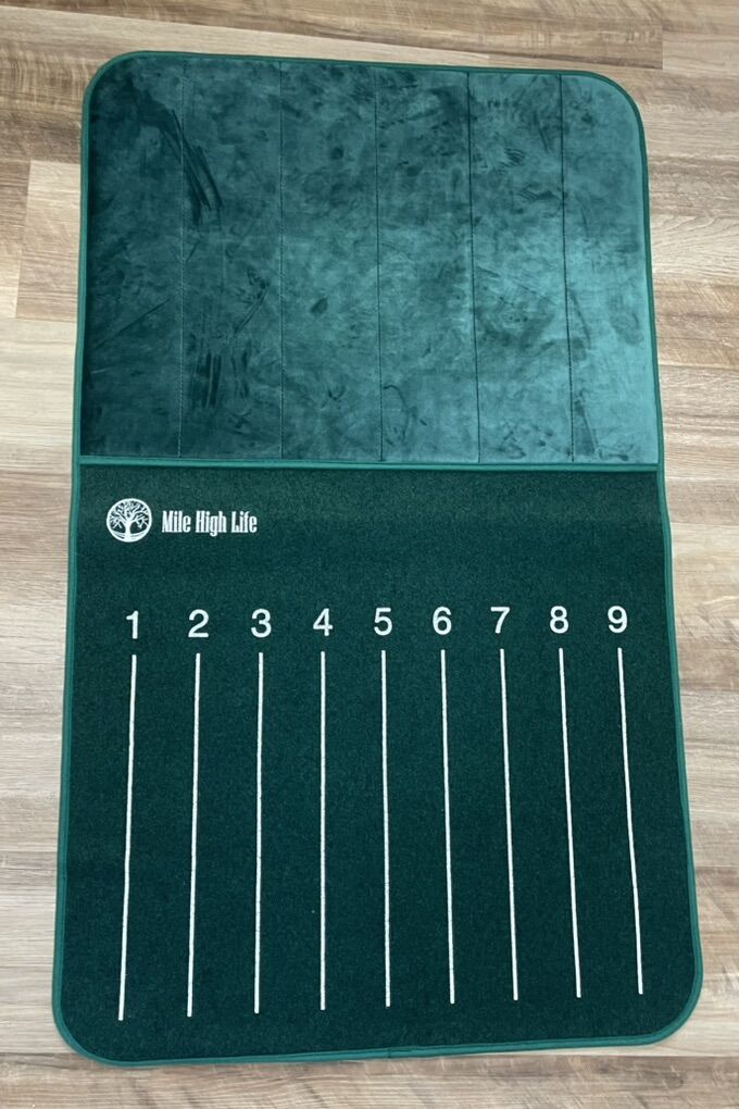VenmoMile High Life golf swing path tracing mat used for practice. • It features velvet turf that changes color when struck by a club to visualize your swing path and impact location. • The numbered lines allow for tracking improvement and alignment across different sessions. • It is designed for both indoor and outdoor use to help golfers identify swing flaws like slicing or hooking.