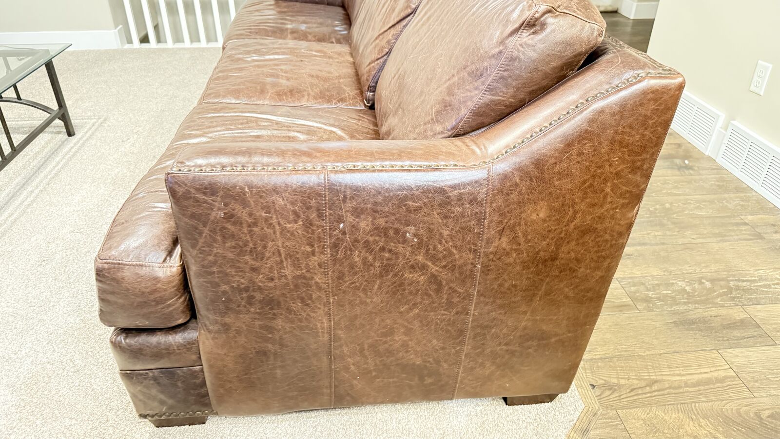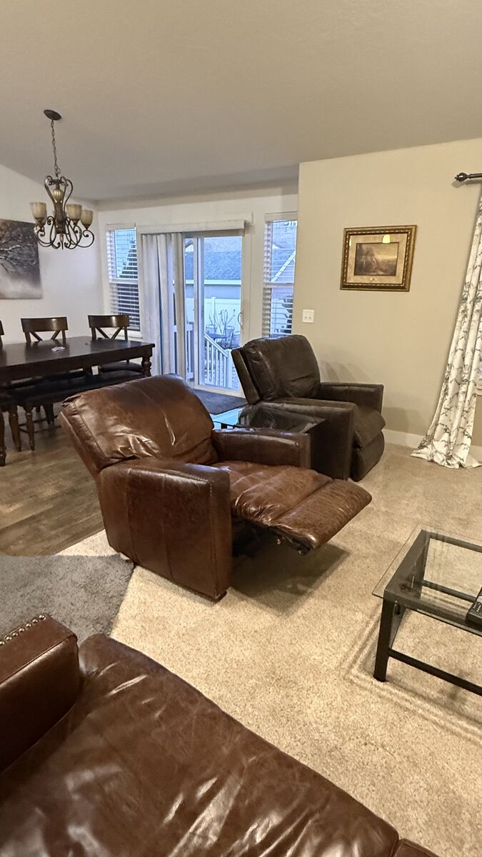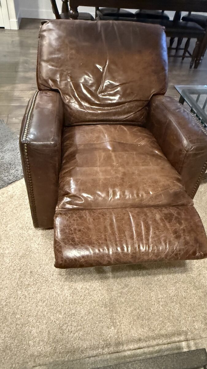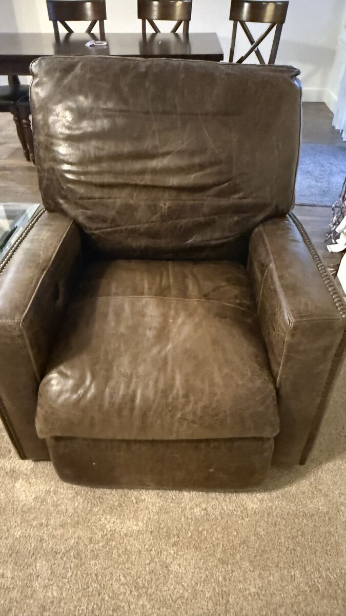 Stylish brown, leather sofa and two recliners. One recliner doesn't work but one does. The one that doesn't might need a new cord. Has that cool distressed look and nail head trim on the arms and base. Three seater couch. Bought at RC Willie. Moving and can't take with me. Call S Space $500 for all.