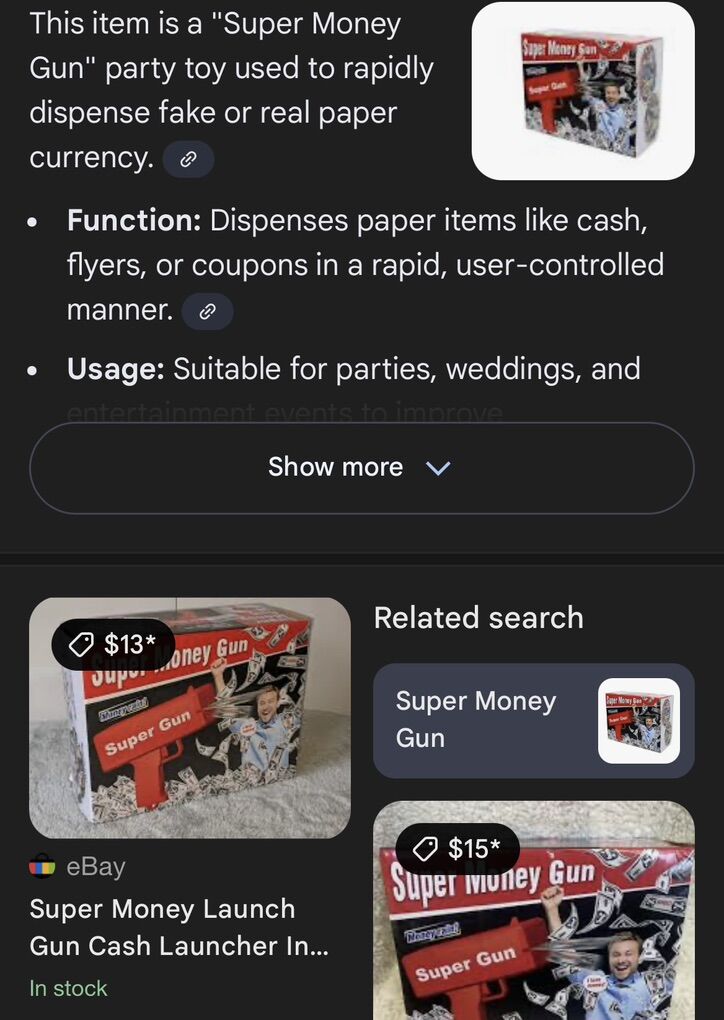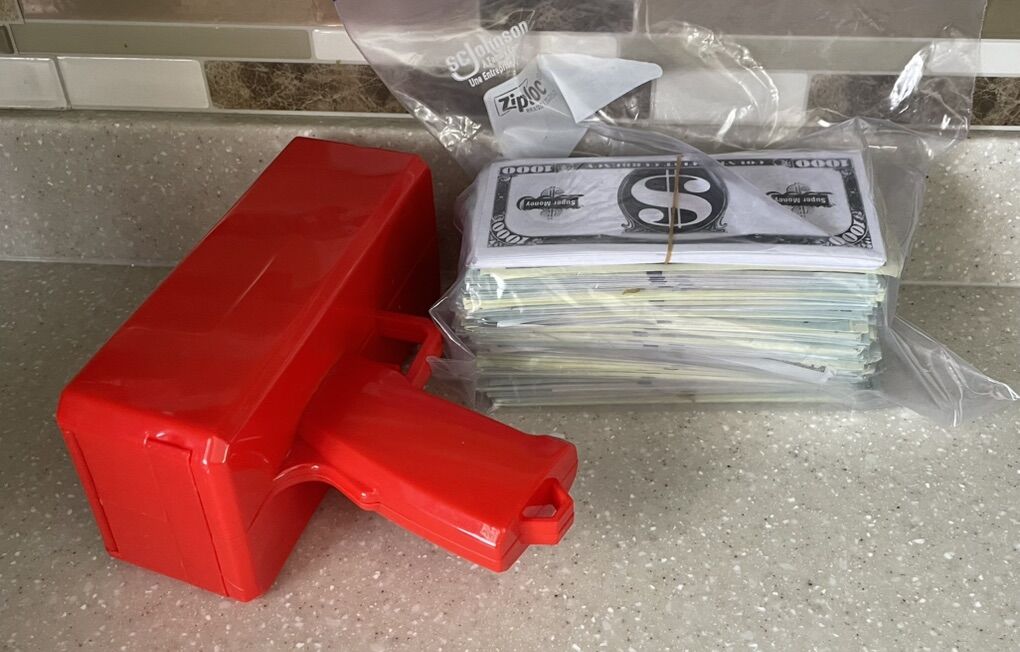 VenmoSuper Money Gun party toy used to rapidly dispense fake or real paper currency. We have used this once at a Birthday Party. Still in great condition.