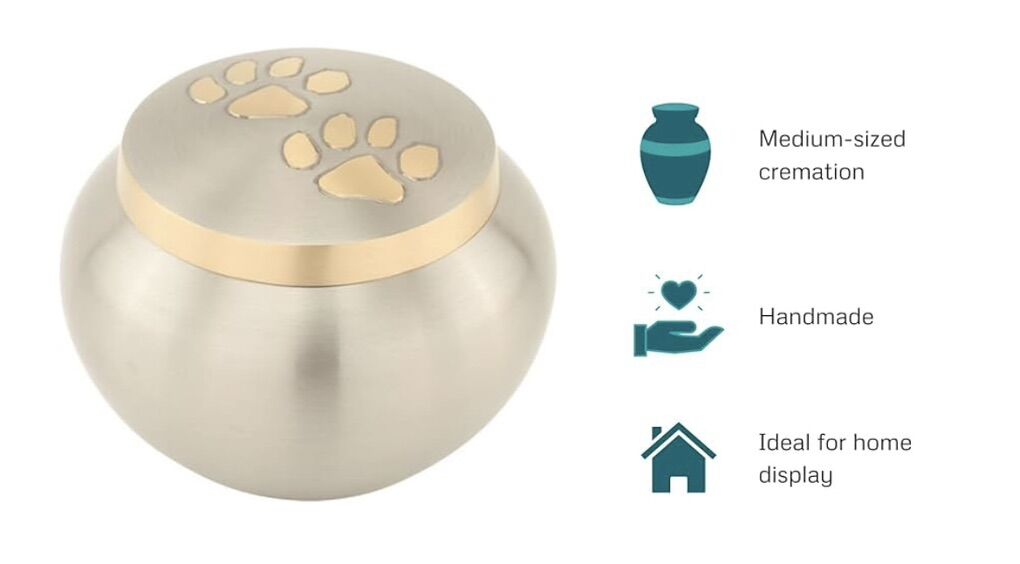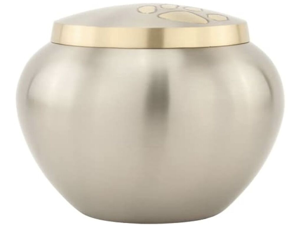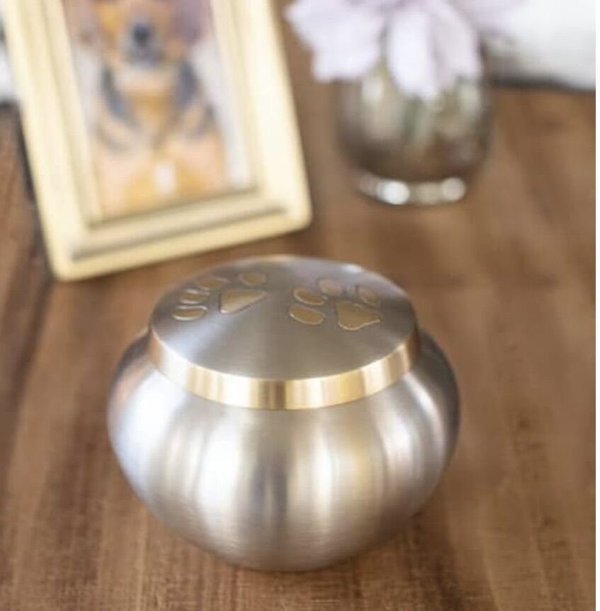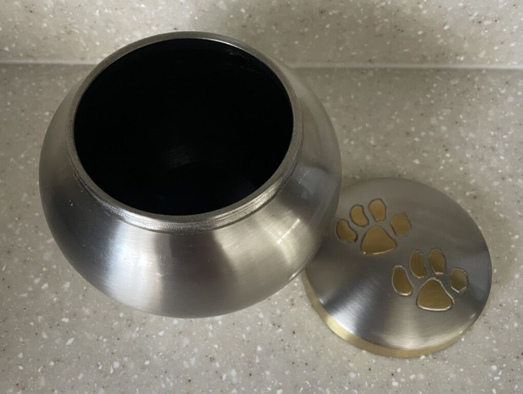 VenmoPaw Print Round Pet Cremation Urn for Ashes in Pewter - Medium, Brass, Silver - Dog & Cat Urn - 4 Inches High. This is new, but there is a tiny dent, hardly noticeable ( see Pitcure).