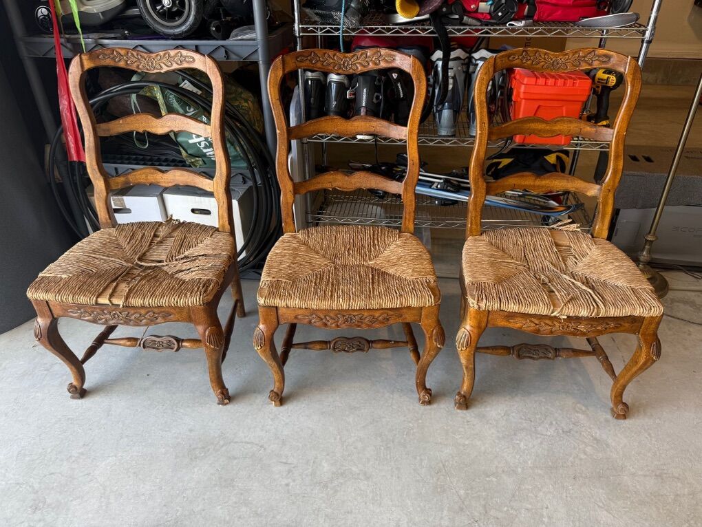 VenmoAntique French provincial rush chairs. Needs a little rush work on 2 of the chairs. Sturdy, good quality chairs!