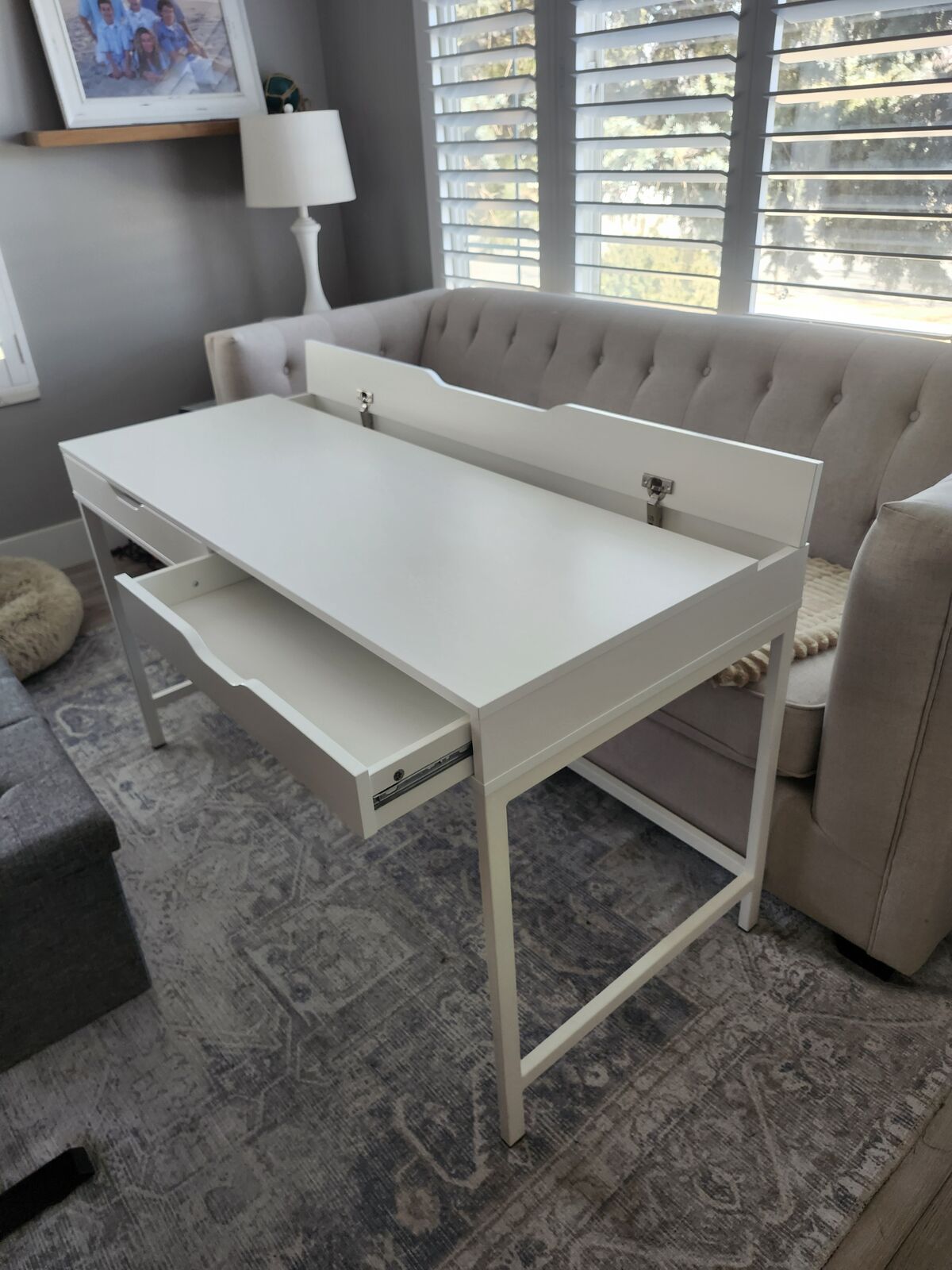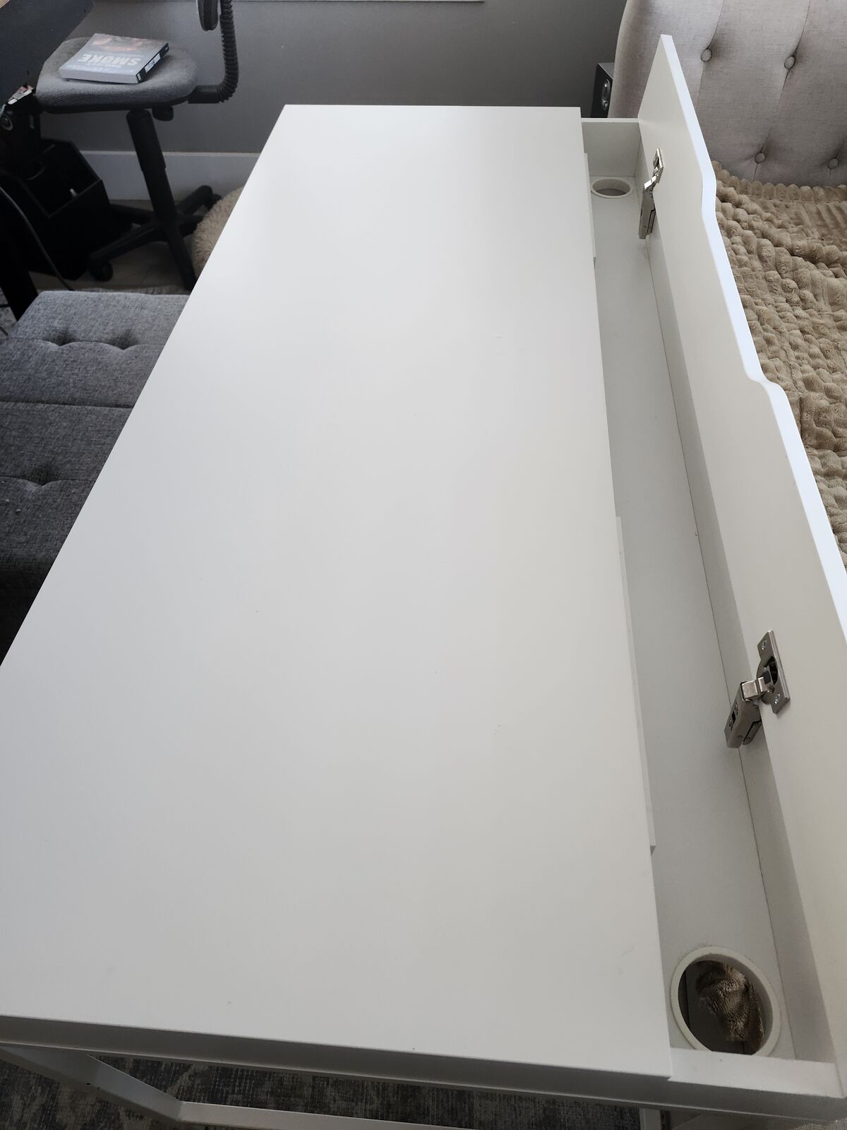 VenmoWhite Alex Ikea Desk. Great conditon, 52" by 22 7/8", built in drawers, and hinged compartment for hidden cable storage. See pictures for more information.