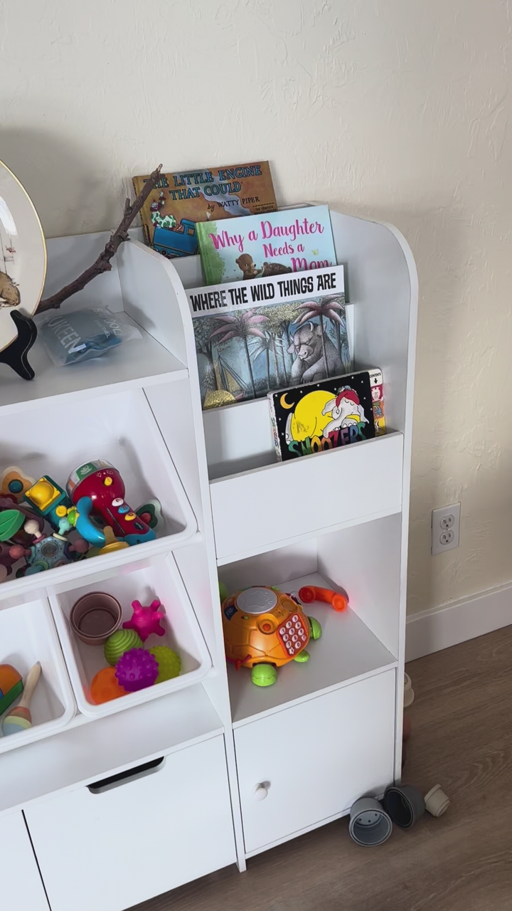 Zelle49.75 wide 41 tall 12 deep White bookshelf for kids, with 4 baskets for toys, 2 cupboards and 2 drawers with wheels. In great condition. Priced to sell. Moving soon.