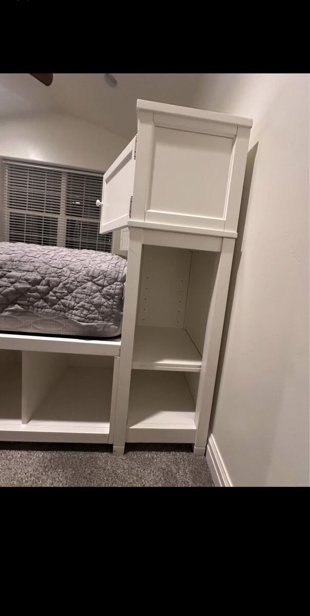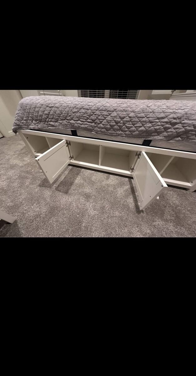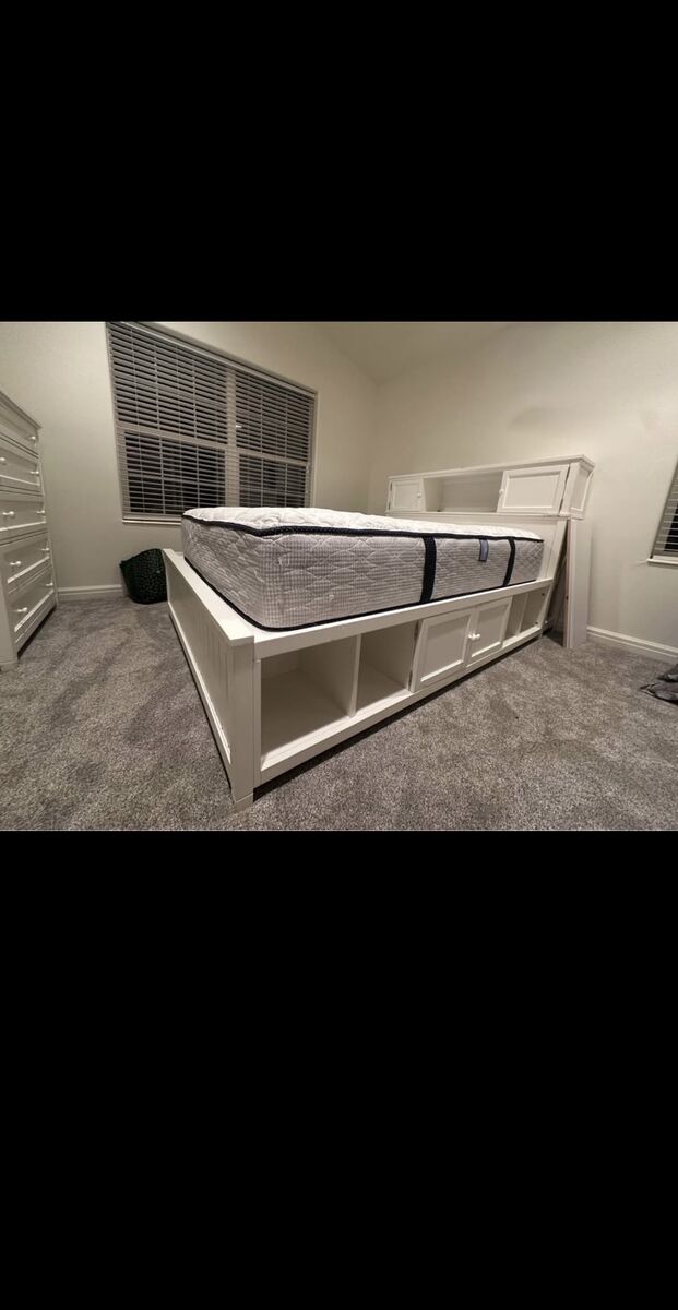 Selling our Pottery Barn full-size bed frame. Solid, sturdy, and great quality like all Pottery Barn furniture. Comes with a built-in headboard shelf for storage. Insane amount of storage space throughout bed frame