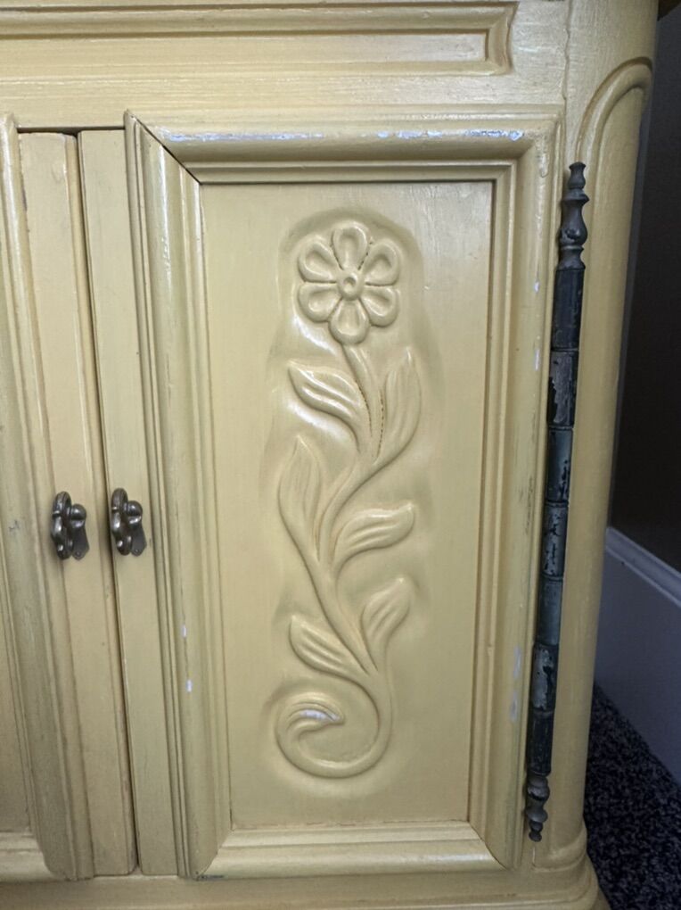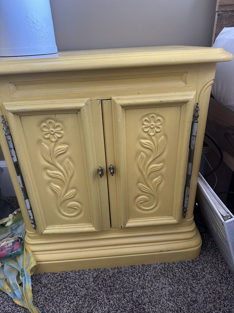 Zelle2 matching solid wood nightstands, with beautiful flower details. It’s painted yellow but you could repaint if desired