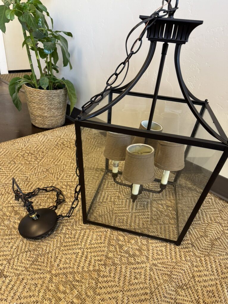 4-Bulb Lantern Style Fixture Size: 25” x 15” Classic lantern design with updated lines. Ideal for an entryway, stairwell, or over a table.