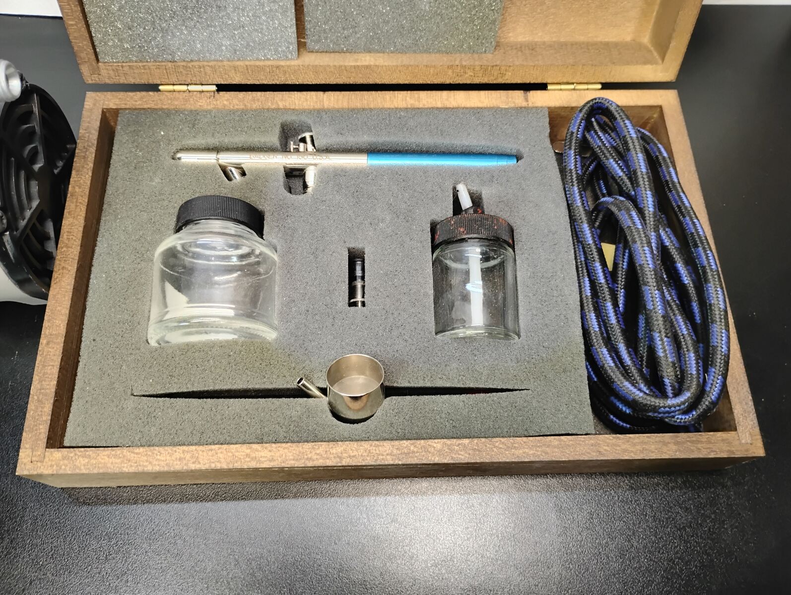 Airbrush: Model 150-4-PK Professional Set includes the "classic" Model 150 airbrush with medium (.50 millimeter) and large (.75 millimeter) needle/nozzles, air hose, color cup, and jars in an attractive wood grain storage case