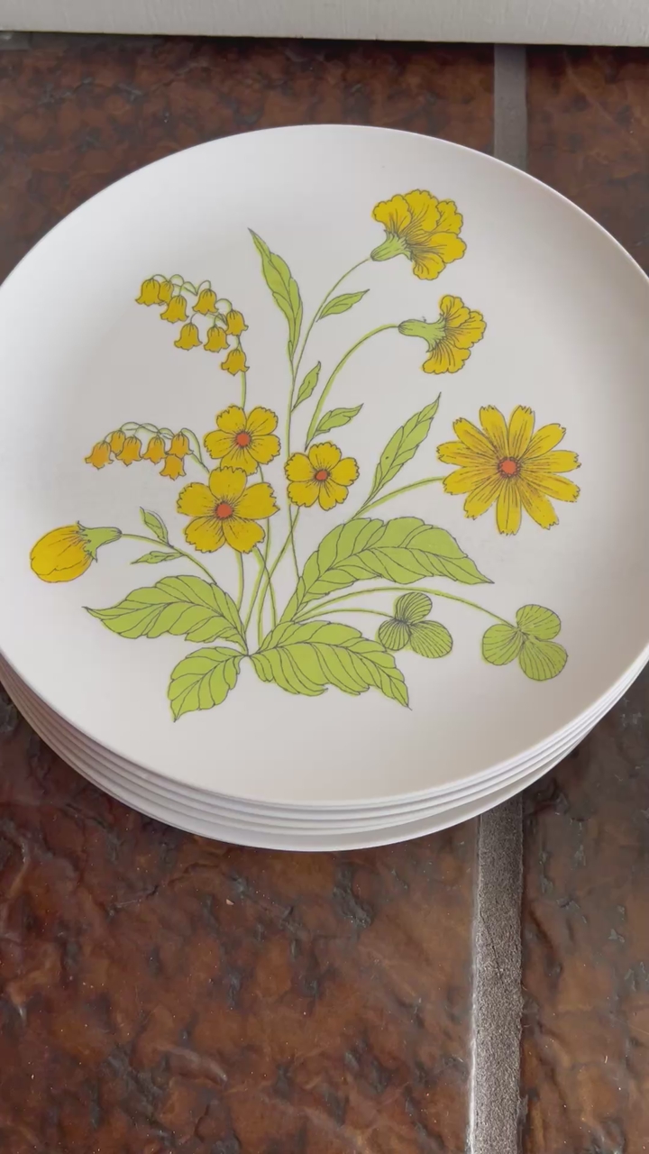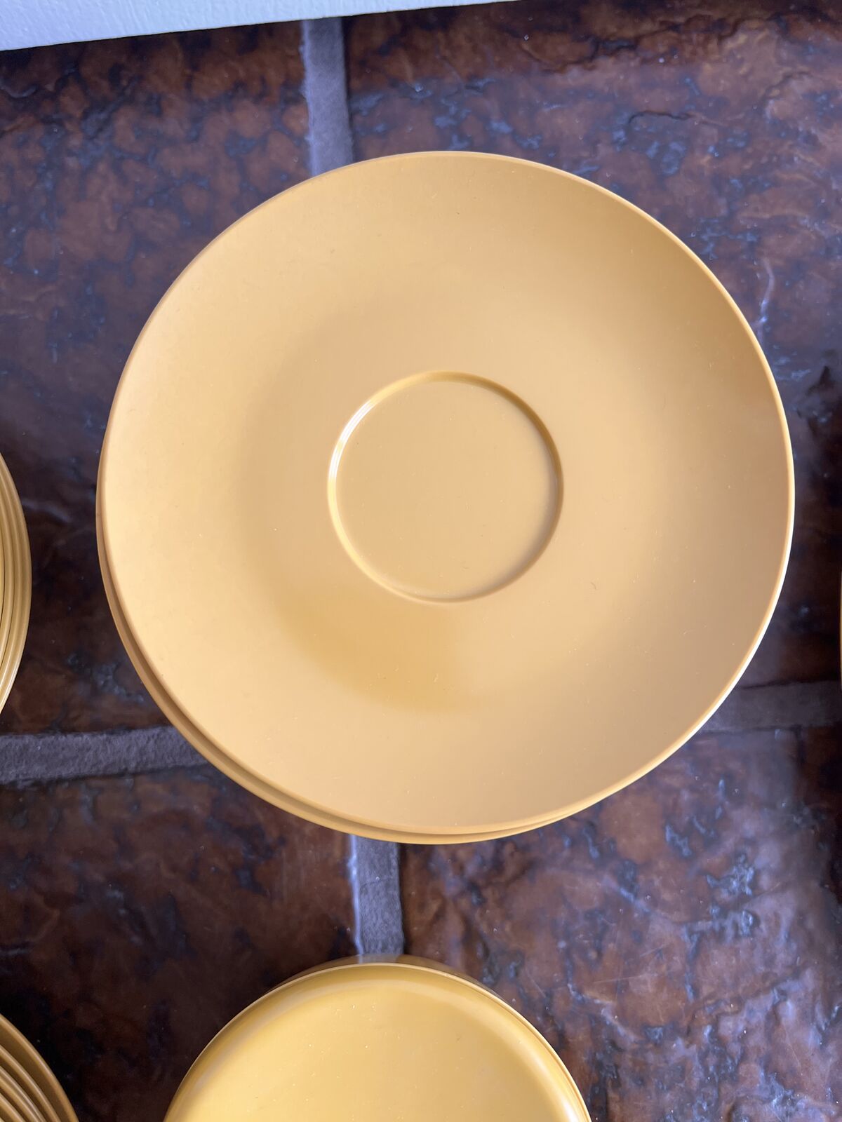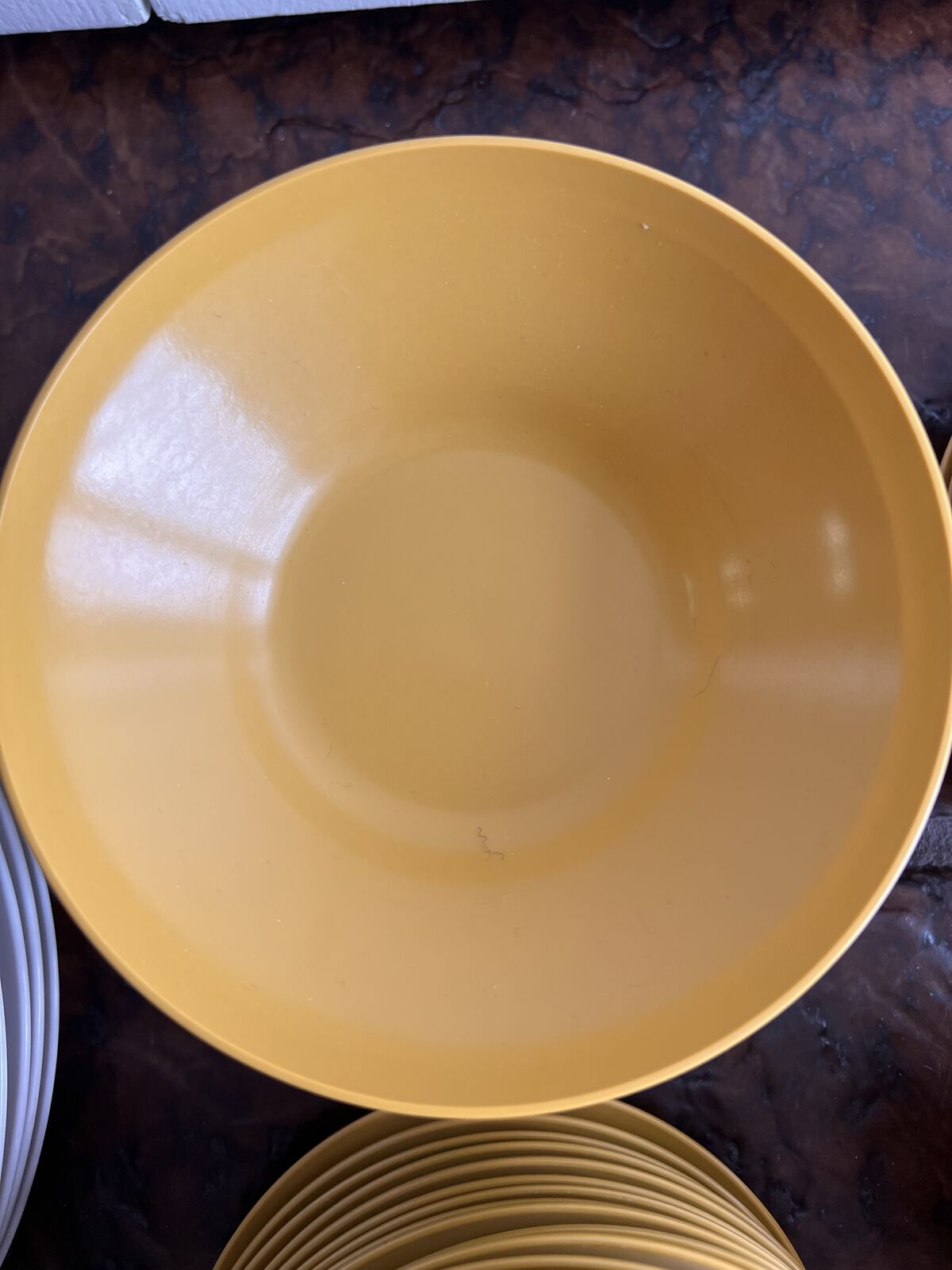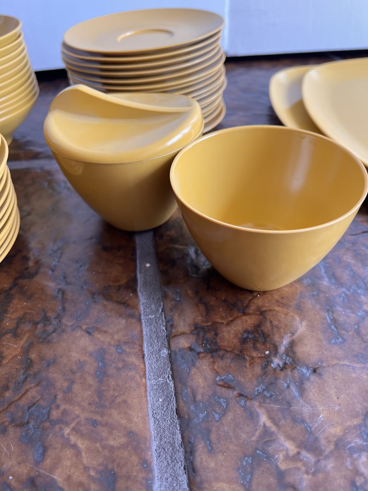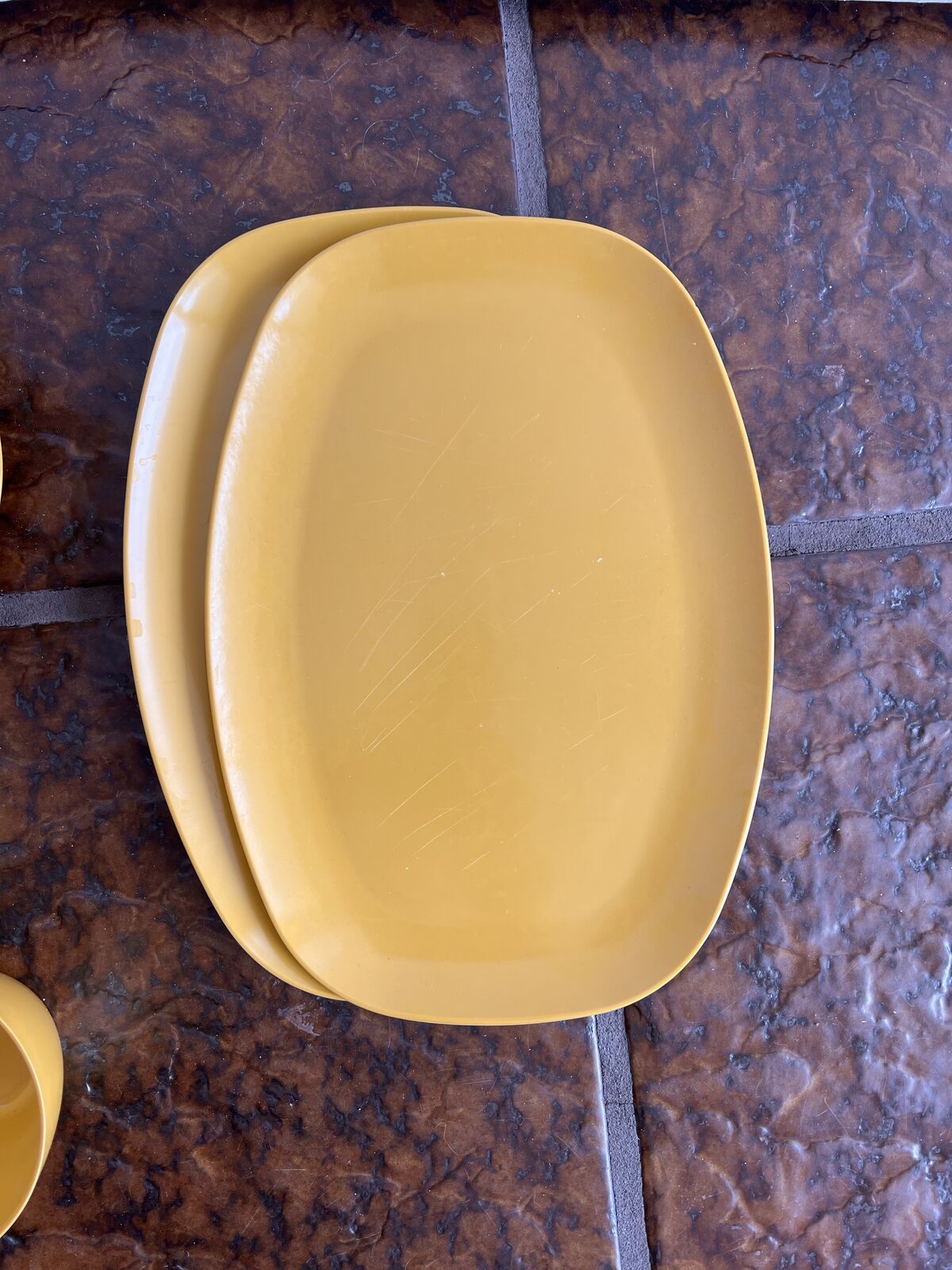 amazingly cute vintage melamine set. 14 dinner plates, 13 small plates, 11 bowls, 16 teacup saucers (no teacups), 2 platters.