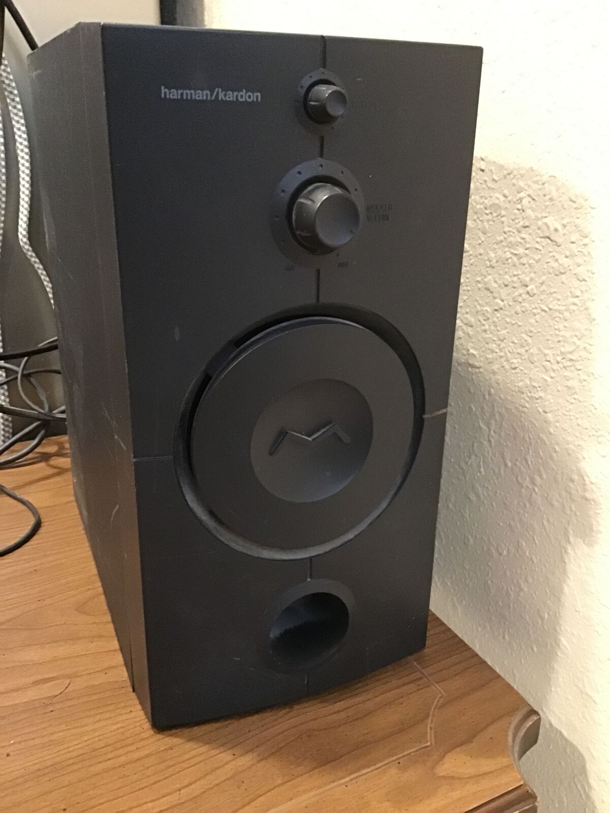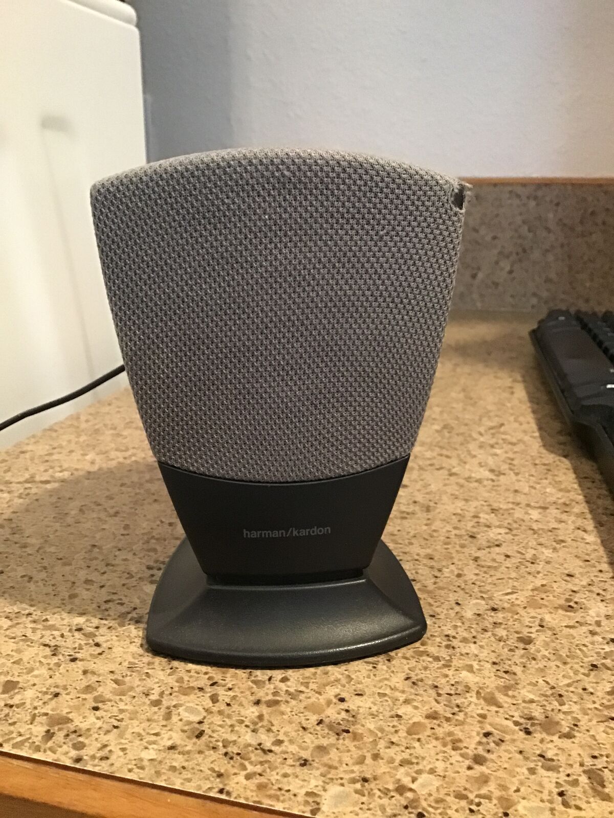 Basic older Harman/Kardon desktop speakers (black, with volume knob – functional but vintage/older model for everyday audio) Wired keyboard and mouse All required cables: monitor display cables, power cords for tower/monitors/speakers, etc.