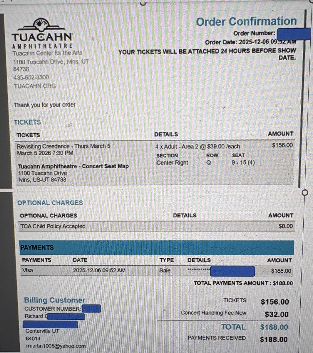 Venmo2 or 4 tickets to a great tribute band that sounds like Creedence Clearwater Revival. Tuachan Mar 5 (thursday). $40 each