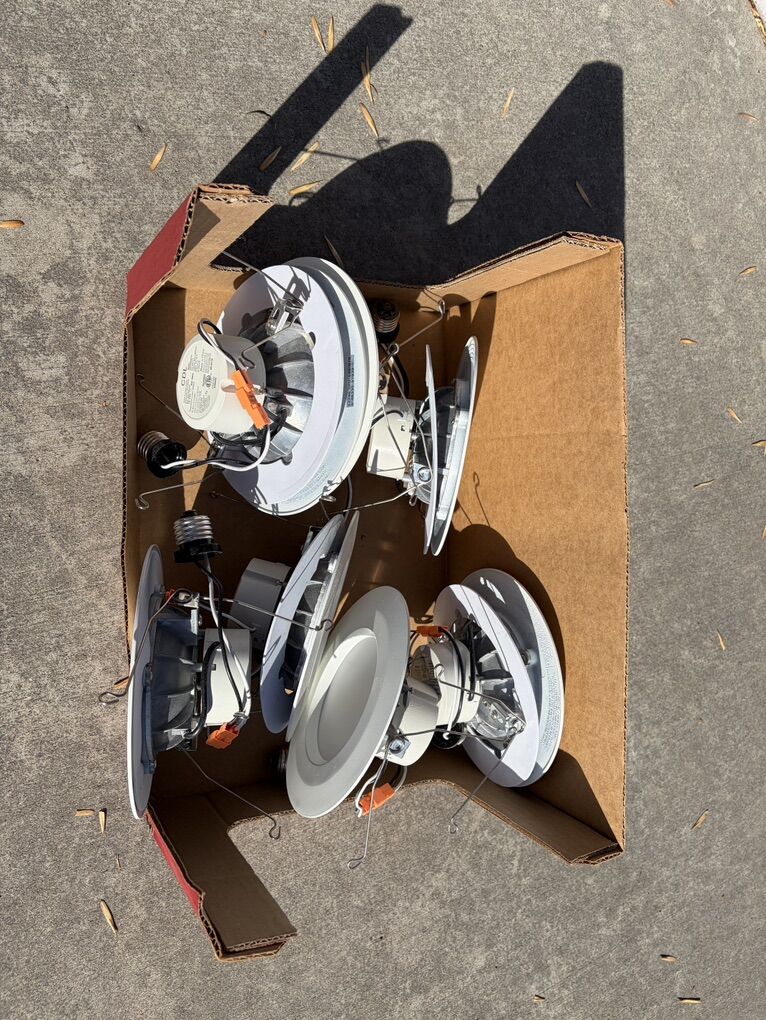 For sale are a lot of seven identical recessed LED fixtures. See photos. What you see there is what you’d be buying. I don’t know a lot about them, except that they were removed from my home as part of a kitchen remodel, and that they were all working perfectly. They go as a group of seven. Message me if you need any clarification.