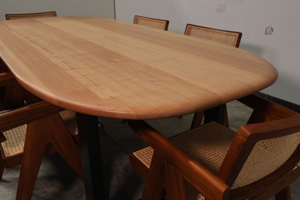 The signature oval, surfboard-inspired silhouette features soft, sculpted edges that transition seamlessly from the ends to the sides, creating a continuous flowing profile. The result is a table that feels both modern and timeless—visually light, yet structurally substantial.