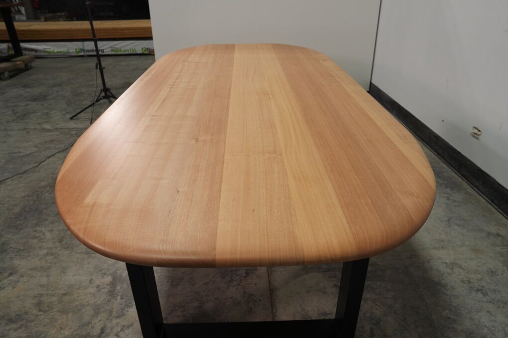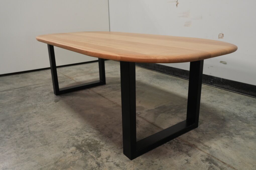 The table rests on powder-coated industrial steel legs, providing a clean architectural contrast to the warmth of the hardwood while ensuring exceptional stability.