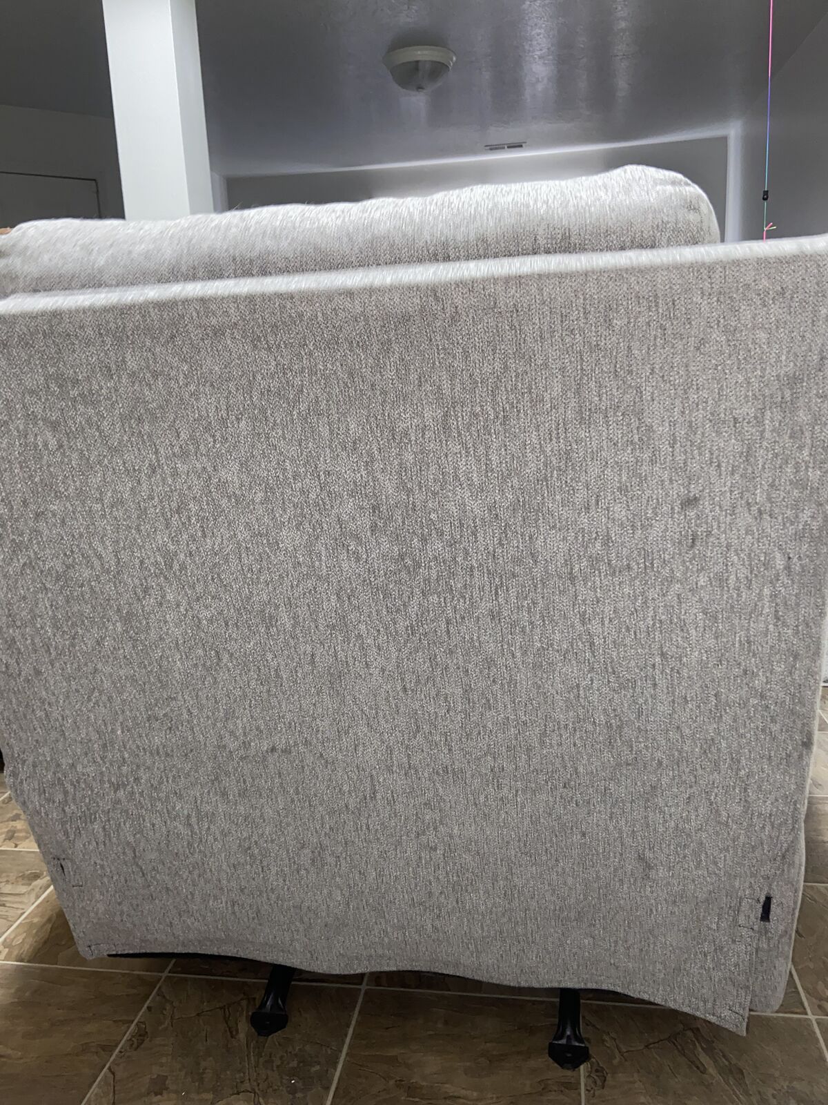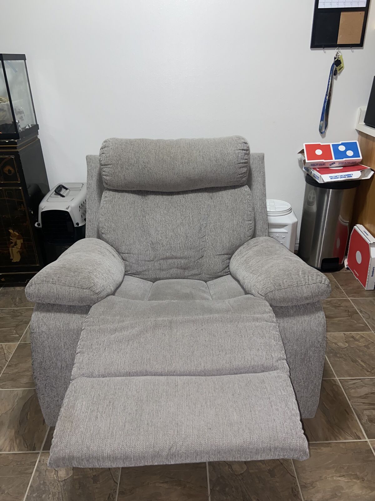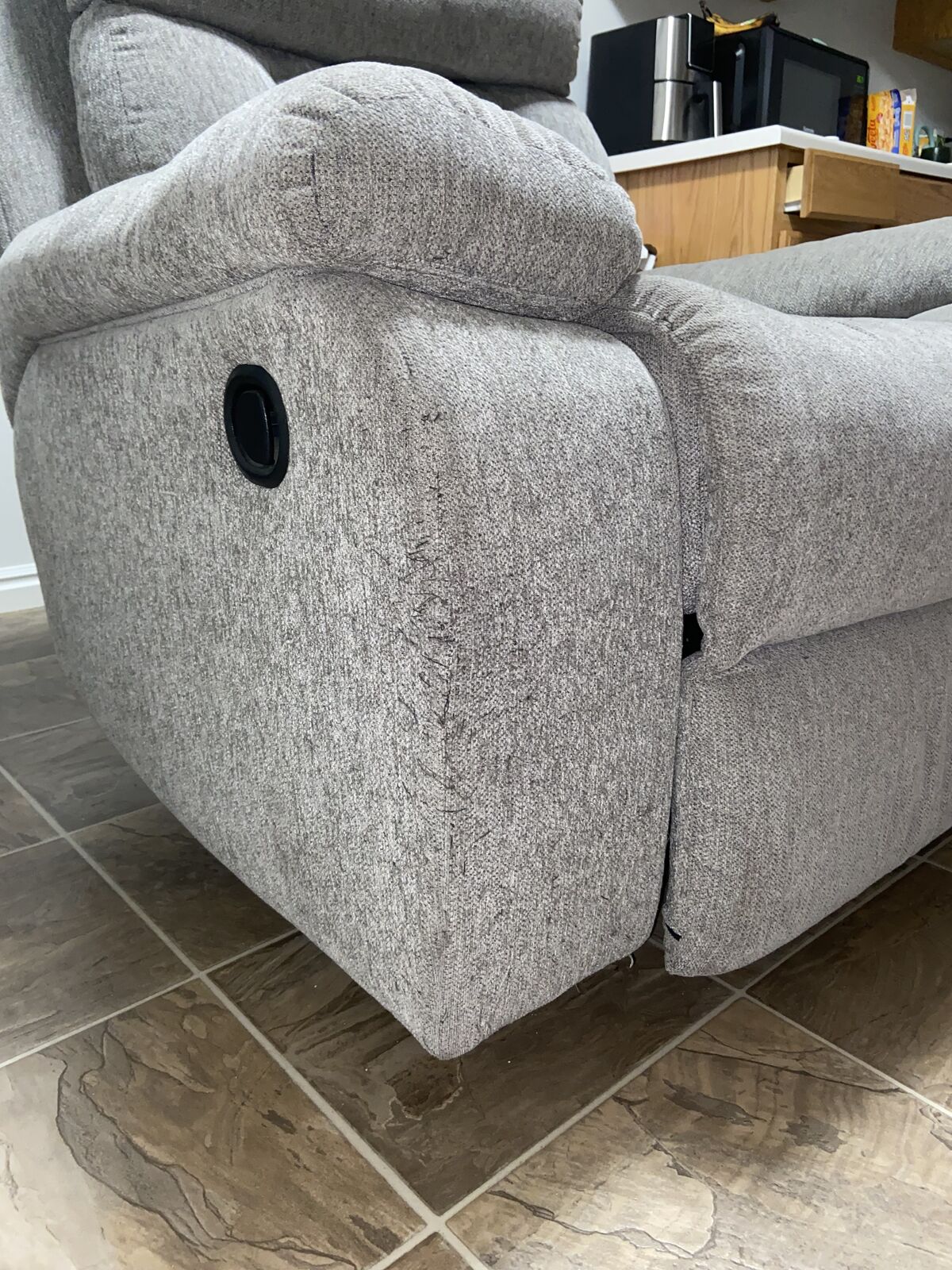 VenmoRecliner, works great and is comfortable. Does have some fraying on the back from a cat. In great condition other than the fraying.