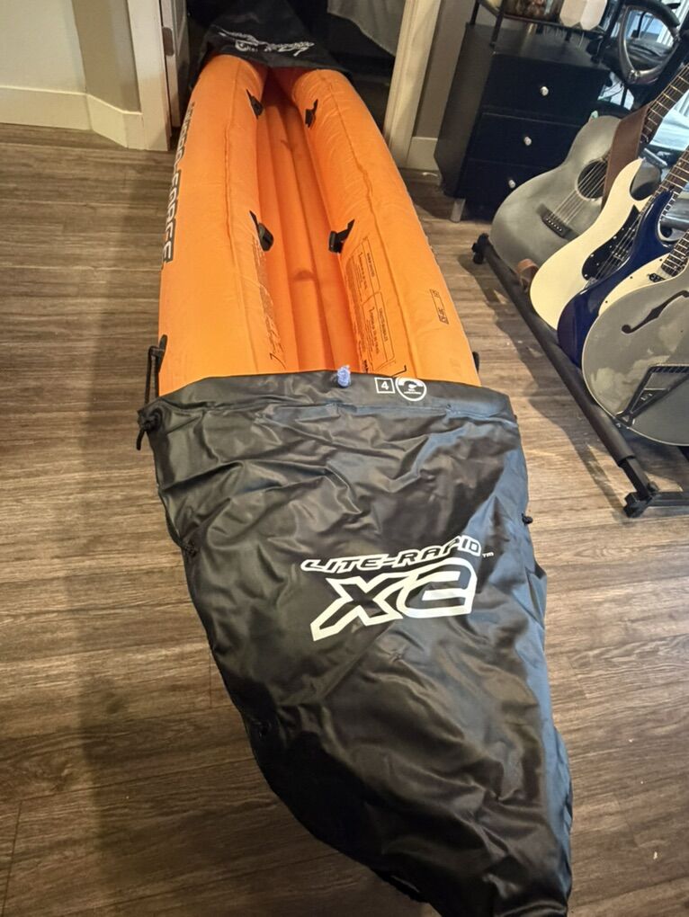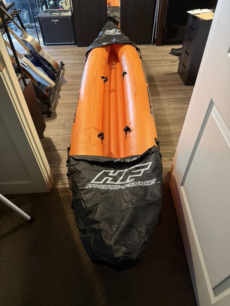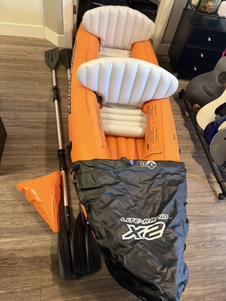 VenmoInflatable kayak with capacity for 2 people. Includes everything pictured as well as plastic fin for the bottom.