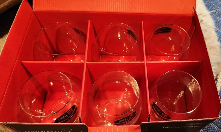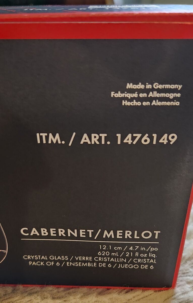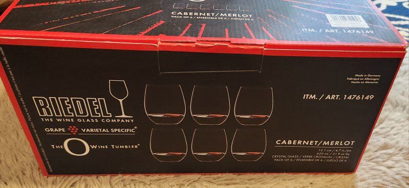 VenmoI recieved these as a gift, and dont have a need for them. They are brand new in the box. Retail online for $49.99 for the 6 piece set. The brand is RIEDEL and they type of glass is a cabernet/merlot. The box says they are crystal. 4.7 inches tall hold 21 fl oz.