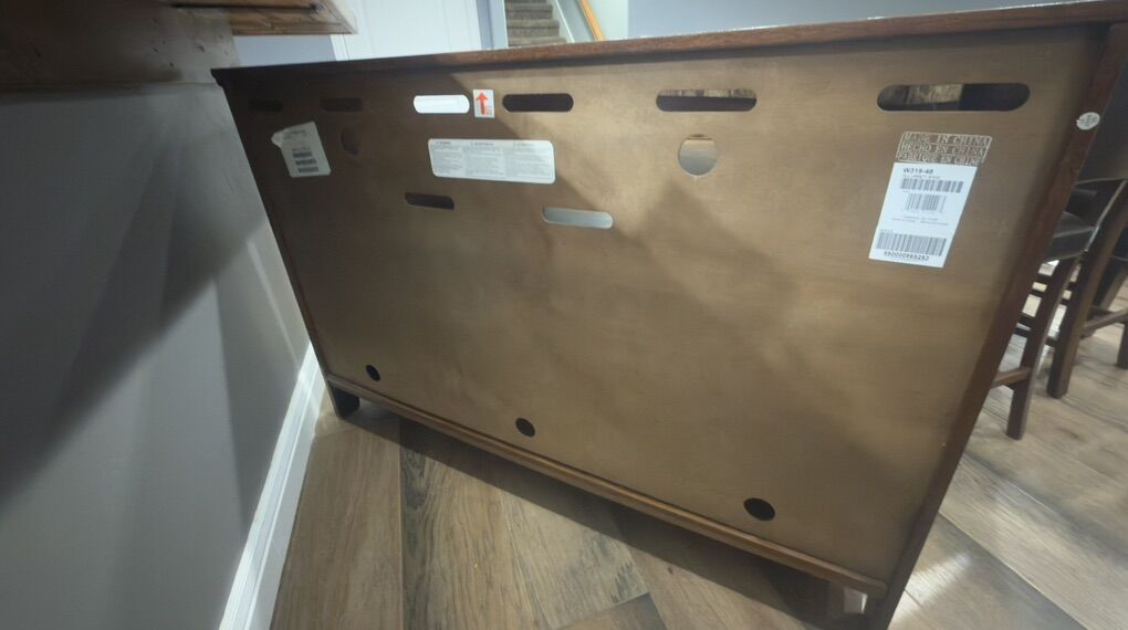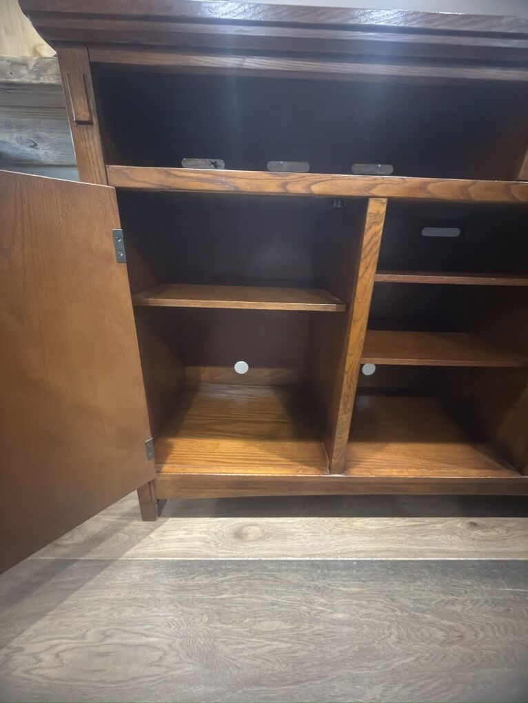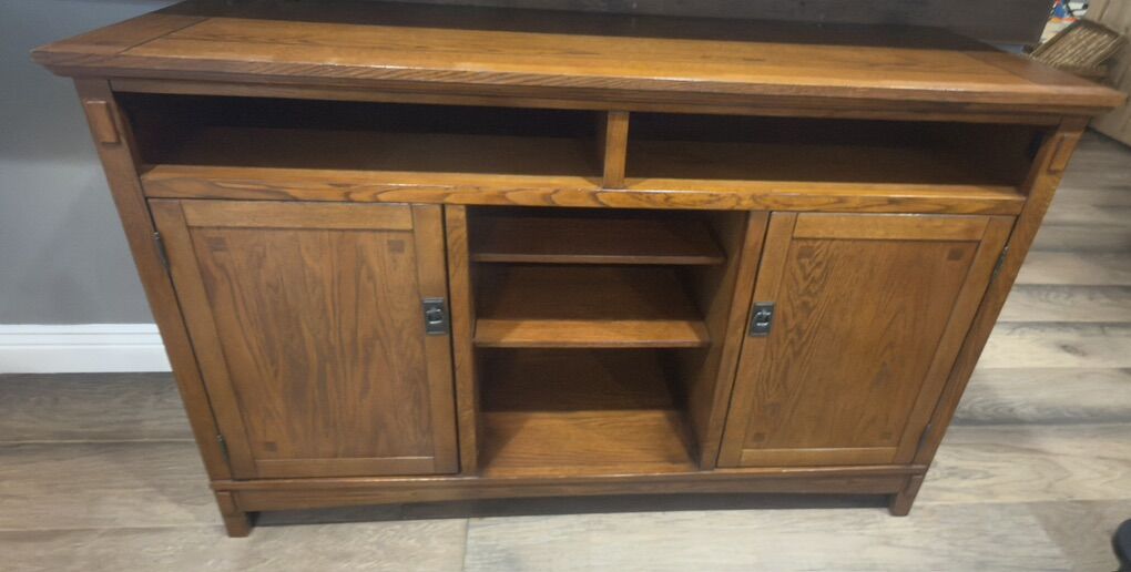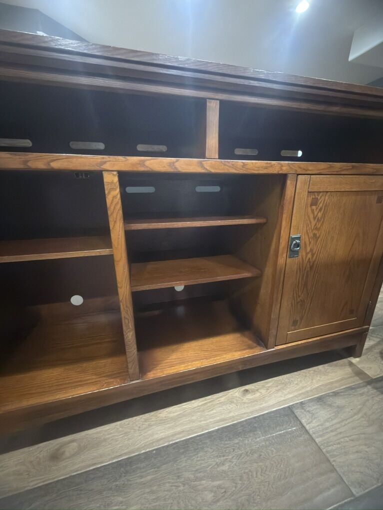 Signature Design by Ashley – Cross Island TV Stand (Mission Style) Beautiful Cross Island Collection TV Stand by Ashley Furniture Industries in a warm medium brown oak-stained finish. This piece features classic mission-style design with aged bronze cast hardware, giving it a timeless, craftsman look that works beautifully in any living room or family space. Dimensions: • Width: 59.88 • Height: 38.88 • Depth: 19.88 Features: • Tall, large TV stand • Mission-style design • Medium brown oak finish • Framed doors with overlay slats • Aged bronze cast hardware • 6 shelves for storage • Vented media compartments for electronics • Approx. 165 lbs – very solid and sturdy Plenty of storage for media components, gaming systems, DVDs, and décor while still looking like a beautiful furniture piece. Condition: Gently used and in great overall condition. There is very minimal water damage on the top surface (hard to see and difficult to capture in photos). Price: $200 Pickup only CASH-ONLY No holds Selling because we’ve moved and no longer have space for it in our new home. Message if interested!