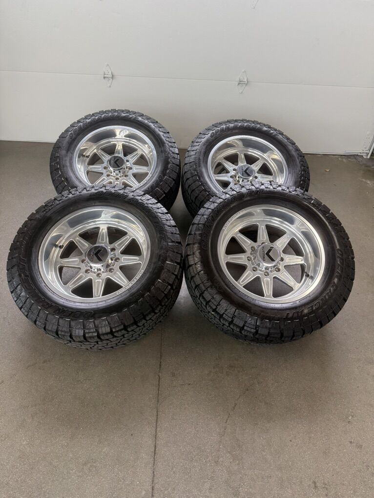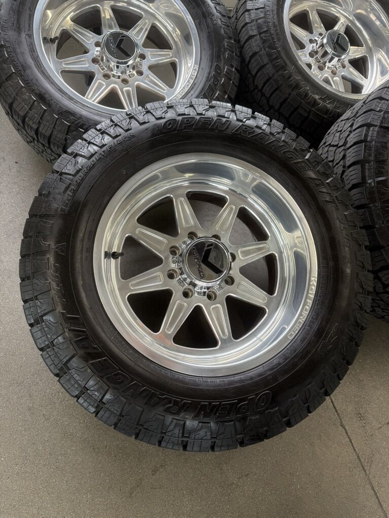 Wheels are 20x10 KG1 “vamp”, -24 offset, billet forged wheels, -24 offset, top of the line wheels, they are in like new shape, no curb rash or damage, could use a light polish, but overall they are in great shape. All of the center caps are also included and in perfect shape. Tires are 35x12.50r20 open range all terrain, load range F, 12ply, top of the line tires. No patches or plugs in them, less then 5k miles so they are in like new shape. This setup is almost $5000 new, selling for a fraction of that.