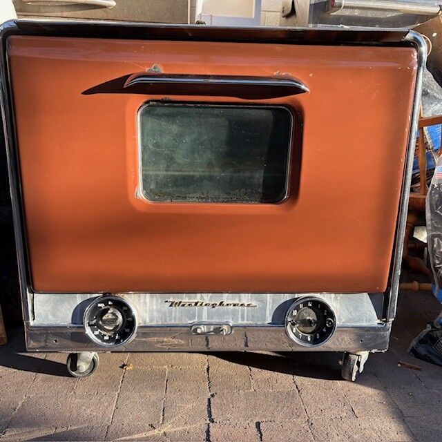 1960s Westinghouse wall oven with original copper/bronze front and chrome trim. Powers on and heats. Includes racks and original knobs.